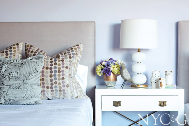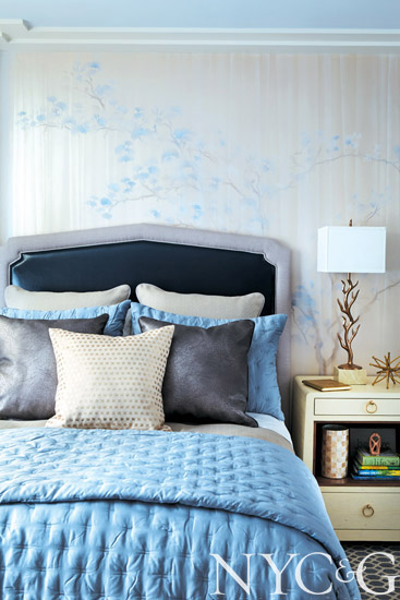 “I’ve used a lot of my own designs in this bedroom, such as a wallpaper from my new collection with Holland & Sherry and fabrics from Duralee,” says designer Philip Gorrivan. “It was important to me to keep the stimuli to a minimum, since the room is all about being cheerful. A color palette of blues and lavenders makes the space soothing, almost curative.”