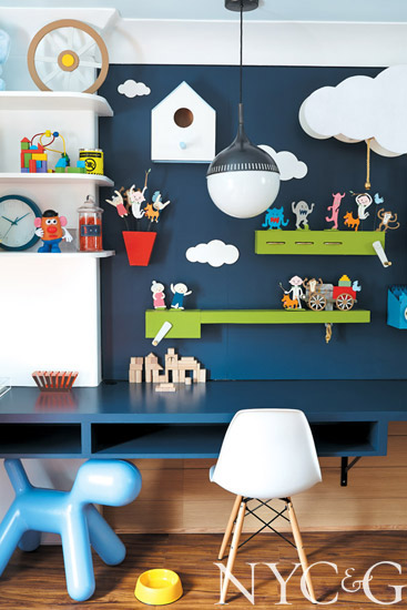 “Ours is the young, hip bedroom!” jokes Brooke Lichtenstein, who teamed up with business partner Yiannos Vrousgos to oversee six students from the New York School of Interior Design to work on this space. NYSID alums themselves, the duo found the room oddly shaped and “softened it by removing all of the harsh edges—the room gives you a hug!” Their group also fashioned a 3-D mural of wooden toys that illustrates “Peach Boy,” a Japanese fable about a little boy born from a peach who goes on a grand adventure and comes out on top. “It’s a story of hope,” says Vrousgos. “We want to remind the families about hope, not struggle.”