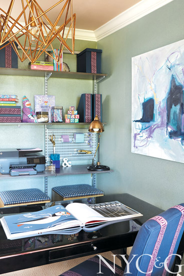 “RMH is a long distance from us, but we knew we could knock it out of the park,” says Traci Zeller, who tackled RMH-LI’s business office with colleague Lisa Mende from their home base in Charlotte, North Carolina. “The space is tiny, but a Maris linen by Tilton Fenwick for Duralee at the windows and the bling of a Currey & Company chandelier dress it up,” adds Mende. “And necessities like floor-to-ceiling shelves from the Container Store and office supplies at the ready are key when business needs to get done.”