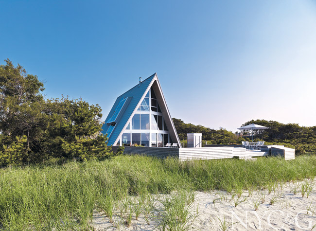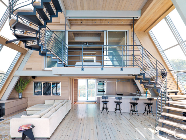 After nearly three years of planning, permitting, and construction, the renovation of our 1965 A-frame on Great South Bay is finally finished, and the results are arresting—even in a community famed for its mid-20th-century architecture. What began as a clunky triangle (think meh-frame with dark, unusable spaces and a treacherous spiral stair) is now a testament to efficiency, simplicity, and beauty, with energy-friendly materials and technologies. As a friend noted upon its completion, “It looks like a glamorous UFO. Of course people are going to want to see it up close.”