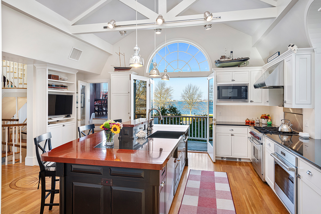 The house features five expansive harbor-view decks integrated throughout. And, it’s definitely set up for hosting. The gourmet kitchen, or galley if you please, offers top-tier appliances and multiple refrigerators and opens to a living room with natural light pouring in throughout. A custom fireplace anchors the space. More recent updates include luxuries in the primary suite, set in what the listing refers to as “the St. Barth’s wing.” It shines with vaulted beamed ceilings, dual walk-in closets, a spa-like bath, private laundry, and idyllic deck access.