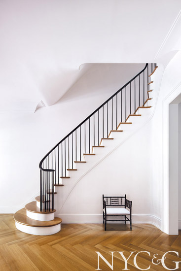 Behind the façade, everything was gutted and replaced with a steel structure, essentially making a brand-new building behind the original stone. O’Neill and Rose established a graceful staircase as the focal point of the newly reunified home, with a winding mahogany handrail and slender bronze posts inspired by Shaker design; keeping it at the center of the footprint made for open, light-suffused rooms at the front and back of the townhouse. “We really thought of it as a giant piece of sculpture,” says Rose. But despite the stair’s impressive stature, the architects actually approached the details organically, finessing its design mid-construction. “We marked up the underside with a pencil, adjusting the angle to make it meet the ceiling in just the right way,” explains O’Neill, who figured out how to fabricate the handrail in a similarly accidental way, discovering how mahogany strips could be joined, like puzzle pieces, to create a continuous ribbon-like curve. “We really enjoy making stuff up,” he adds, “and then getting things built.”