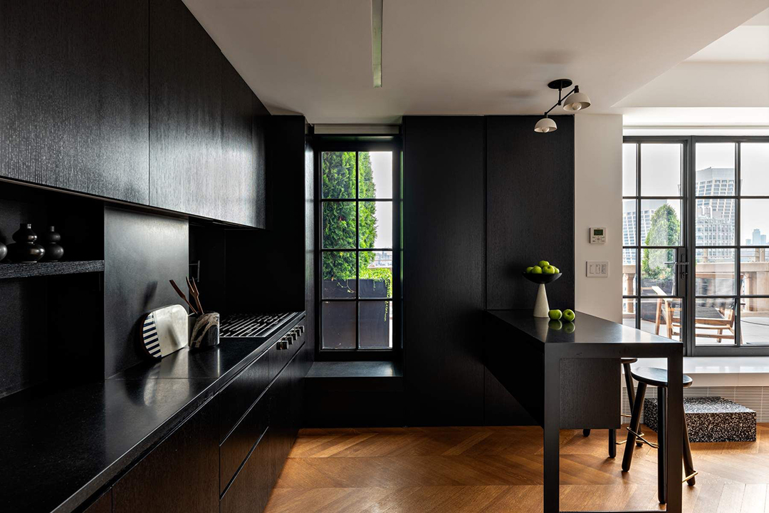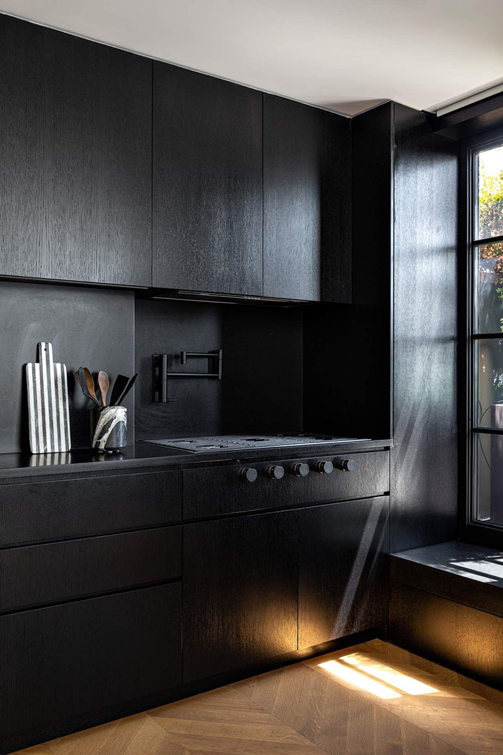 Artfully designed by Otherstudio Design and AR Arquitetos of São Paulo, the interiors are minimalist yet striking. Black details, such as the casement windows, punctuate a sense of bold refinement while oak chevron floors and other touches of wood enhance the indoor-outdoor, California-style feel of the home. The moody kitchen, with Black Absolute granite countertops and ebonized oak cabinetry, is balanced by light that comes from South, West, and North exposures. It opens to the adjacent living and dining room, which is a breath of fresh air thanks to its edited, less-is-more decor principles. A black Marquina mantle also awaits here.