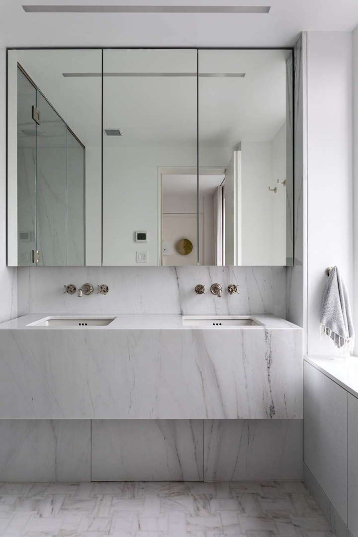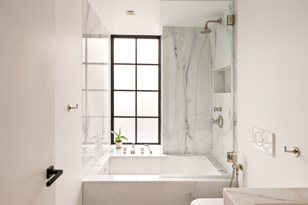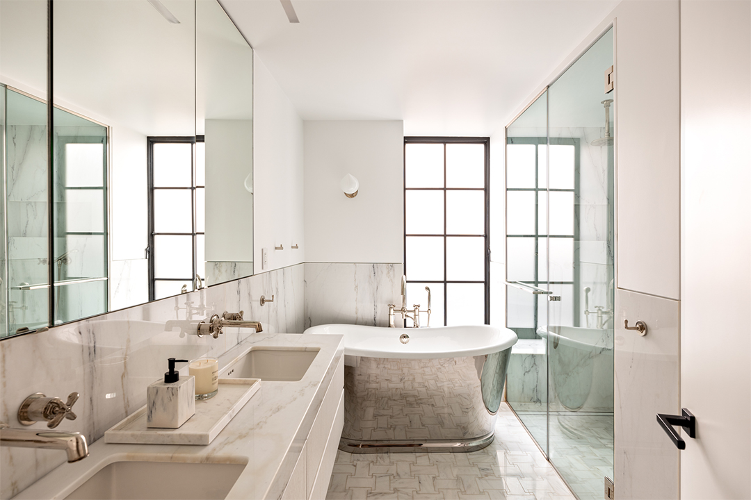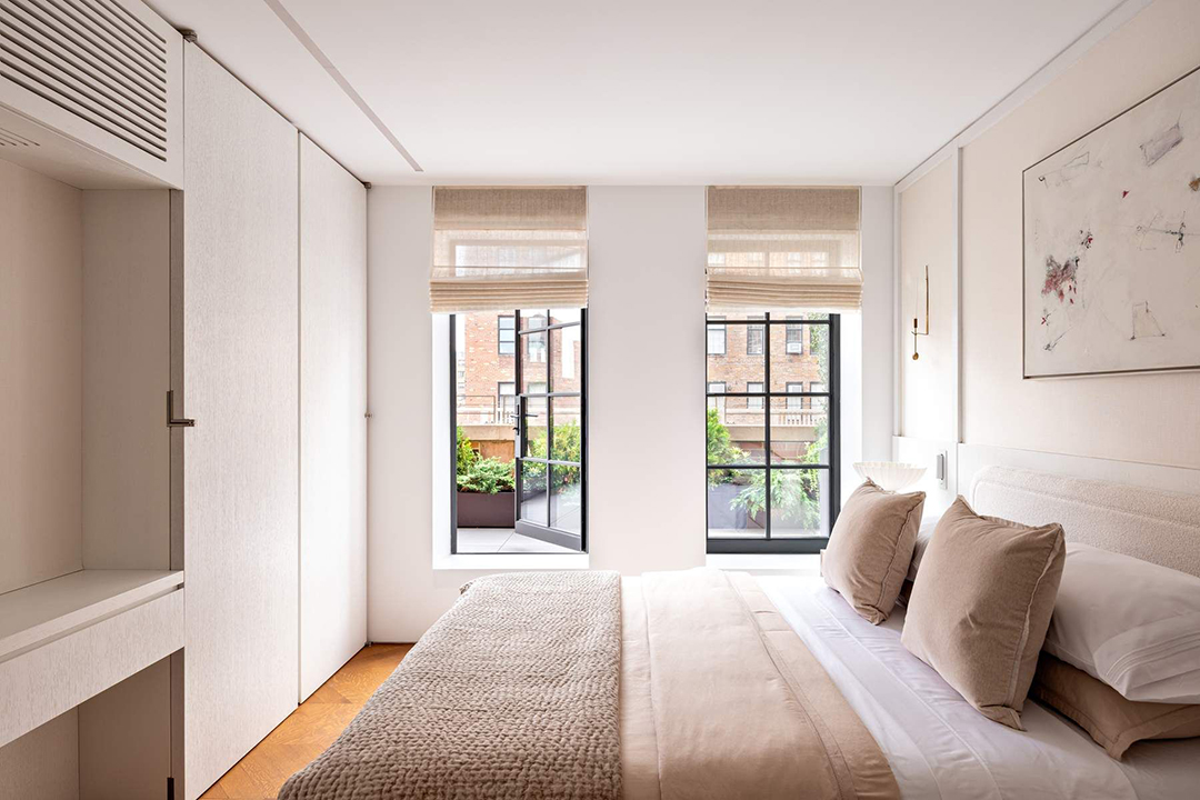 The apartment occupies a modest portion of the 16th floor, accessed by a dark steel staircase that feels almost like a sculpture. This lower level only holds a home office (or walk-in closet) and one of the primary suites. It also has a spa-like bathroom with its own aromatherapy system to make it a private paradise for wellness. Upstairs, the other primary suite and bedroom sit closer to all the lovely living spaces.