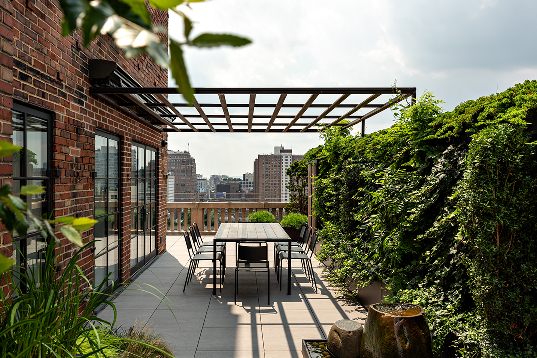 Stepping outside, Michael Trapp is the genius behind the 1,000-square-foot wraparound terrace’s design. It boasts a pergola crawling with wisteria, a fountain, an outdoor shower, two storage sheds, and a full irrigation system. Perhaps the right buyer will be an avid gardener, or just someone who wants to be able to entertain outdoors with iconic views.