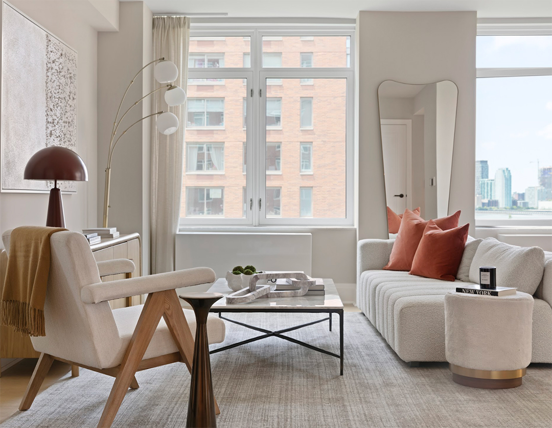 Moving downtown to Battery Park City, Tribeca Green is yet another towering building embracing a natural, fresh vibe. It has 265 units and a dazzling location point for taking in the city skyline. Designing a select few of the residences, Vesta Homes artfully offsets the intensity of ‘the city that never sleeps’ with layers of neutrals and light throughout.