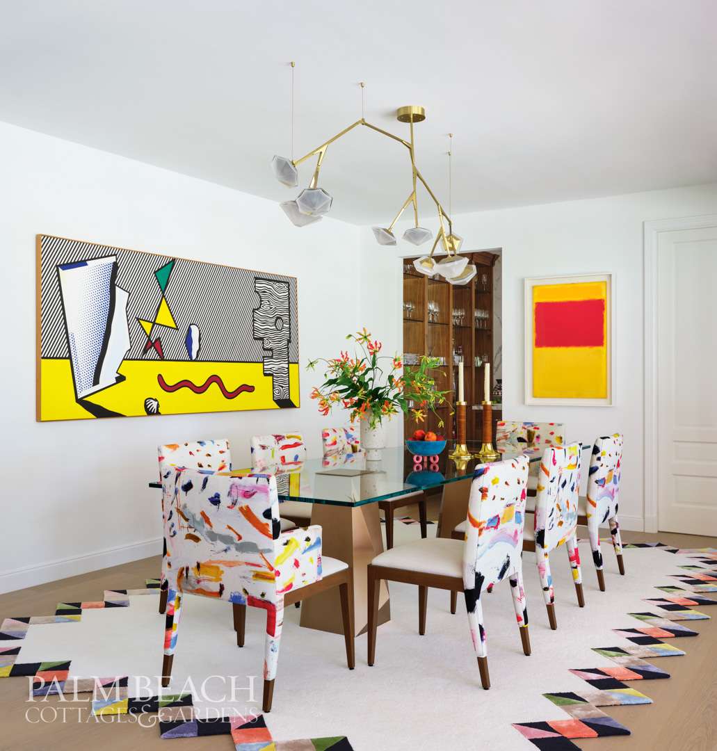 The starting point for the interior scheme was a bold multicolored fabric by Pierre Frey. With a large repeat, it seemed ideal for the dining room chairs, each one upholstered in a different section of the pattern. And to fit alongside major works by Rothko, Lichtenstein and Warhol, Kah commissioned custom rugs, tables and beds that were bold but still complementary to the artwork.