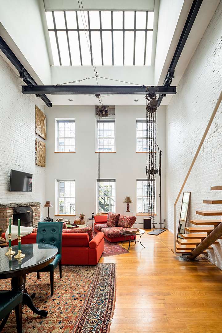 The sun-drenched duplex on the back of the building provides a stark contrast with its white exposed brick and also has a separate entry. This space could serve as an artist’s separate wing away from their work. It also wows with sweeping 26-foot foot ceilings and a large skylight, plus an original iron chain pulley that nods to the home’s past. Other amenities to look forward to include two lower spaces long used as dark rooms, a sauna, and a south-facing terrace.