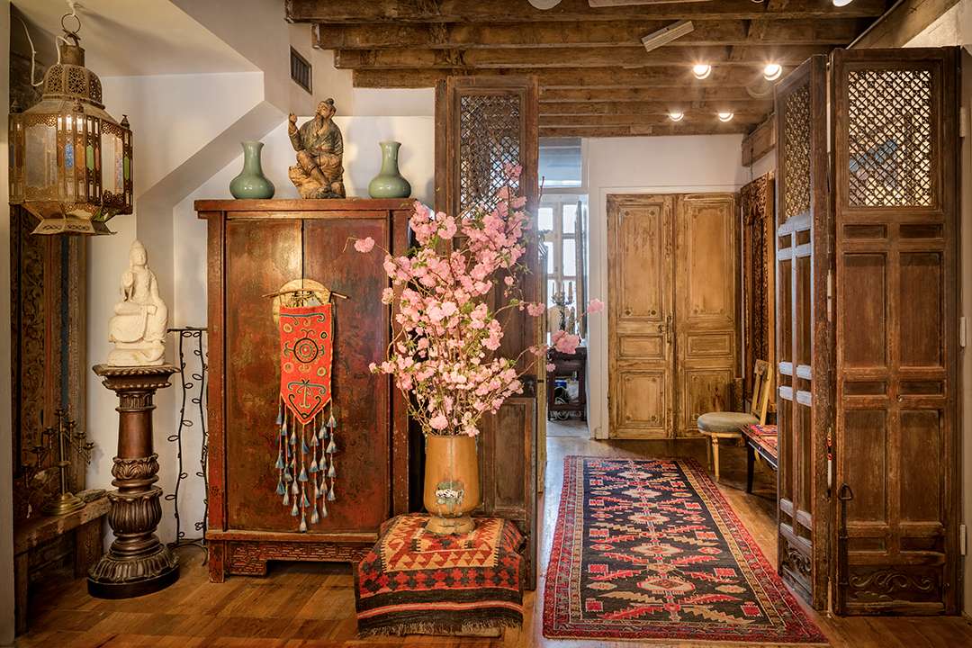 Spanning four floors and 5,000 square feet, there are almost two design styles melded into one—the artsy and eclectic studio side, and the bright and refreshing living spaces. The entry opens to a vast, rich living space with 25-foot ceilings and a huge skylight. It’s here that Aich often hosted artsy gatherings, especially musical performances and plays. The upstairs primary suite is right upstairs, filled with the same creative spirit. It boasts rugged wood beams, brass finishes, and even a steel tub sat next to a fireplace.
