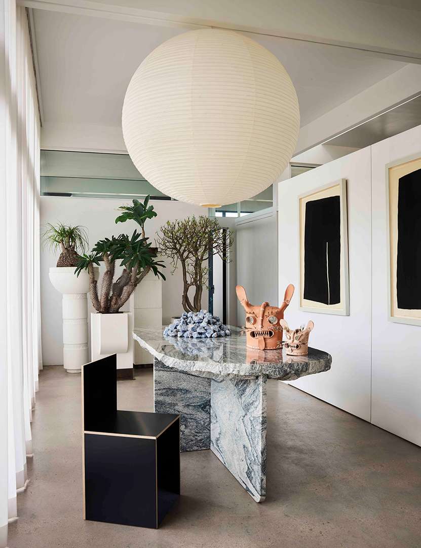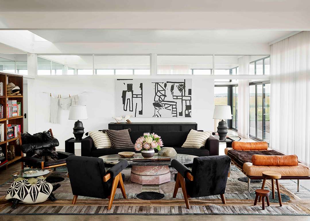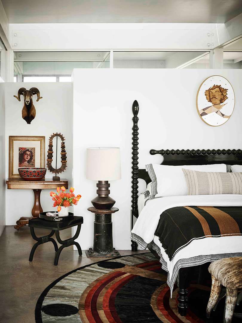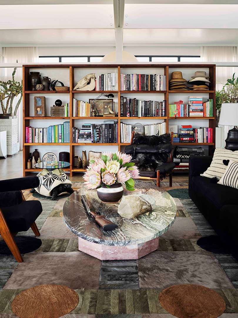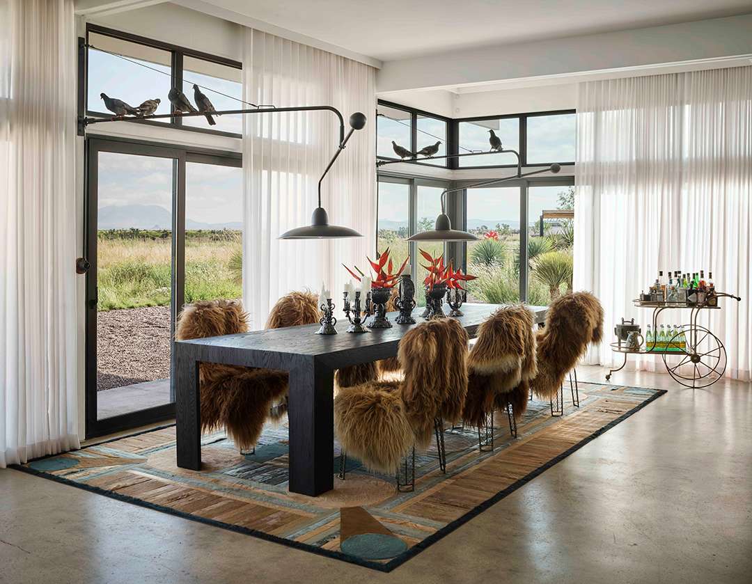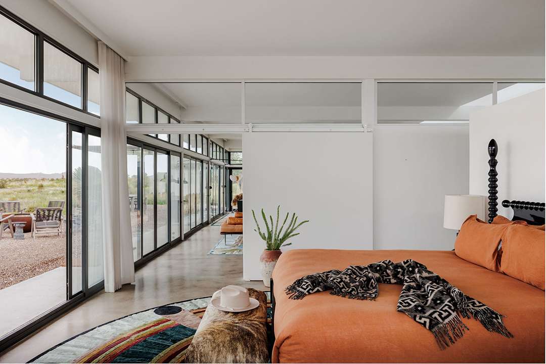 After touring various spots, he finally laid eyes on this 10-acre estate and began conceptualizing his desert oasis. Friedman deeply considered the location when designing the 2,304-square-foot home, which reflects the artistic aura of Marfa and spotlights the rugged, mountainous landscape in the distance. Its glass-box architecture and sustainable technologies fulfill his desire for simplicity and connection to the land, while the decor inside exudes boho maximalism.