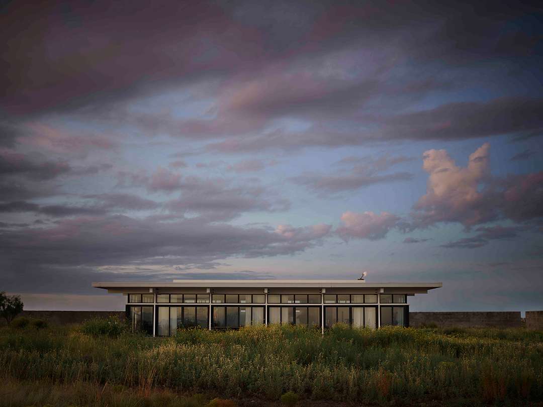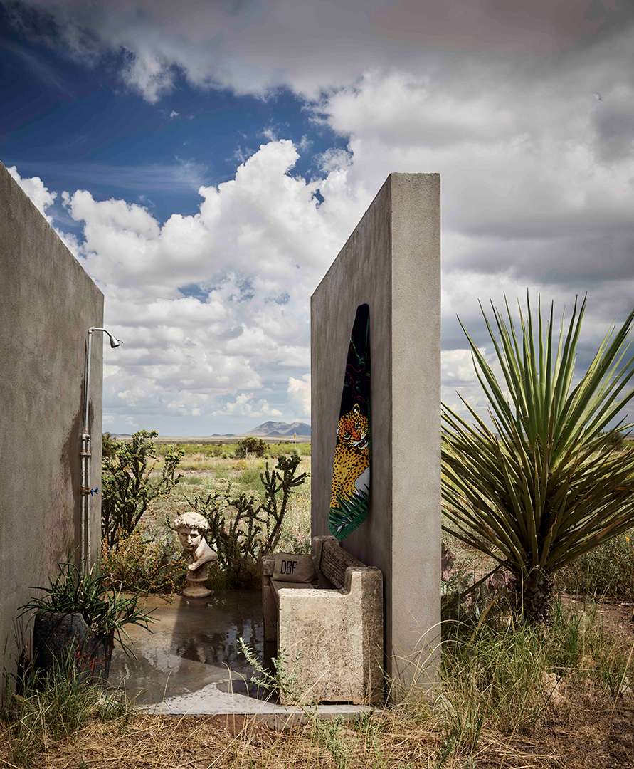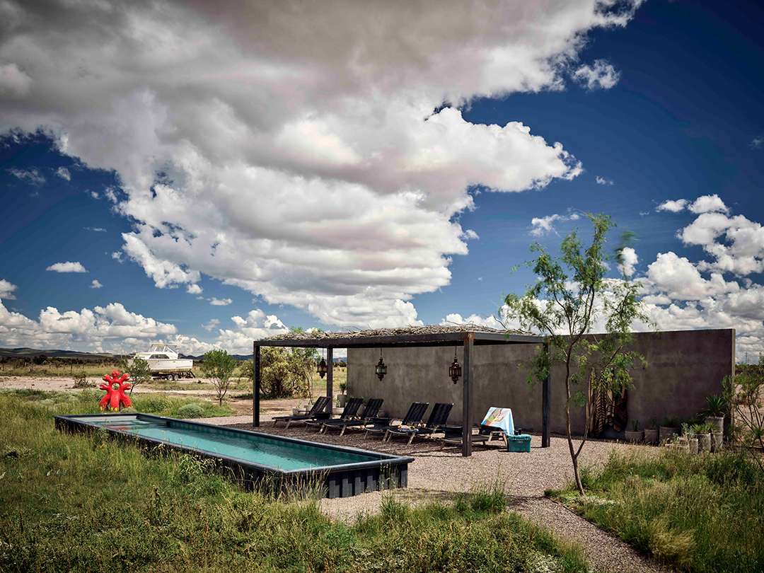 With the hot climate and desert mystique, Friedman also gave great thought to fashioning the outdoor spaces. Winding paths bring you from the main residence to the pergola for alfresco dining, a sleek pool and relaxing hot tub, and an outdoor shower hidden behind concrete walls. He planted trees and long prairie grasses, and placed sculptures by Brett Douglas Hunter around the grounds, paying homage to Marfa’s creative community and its legacy of Donald Judd.