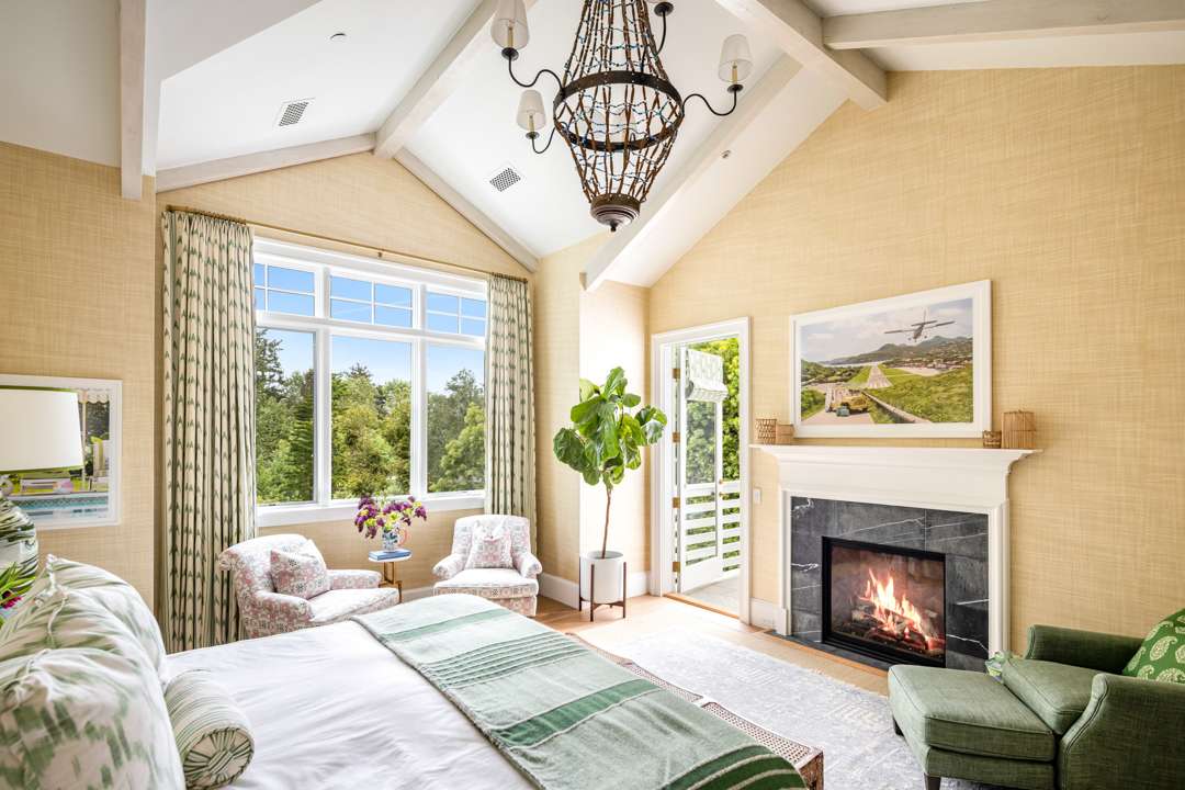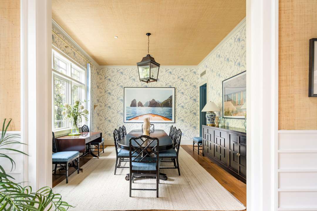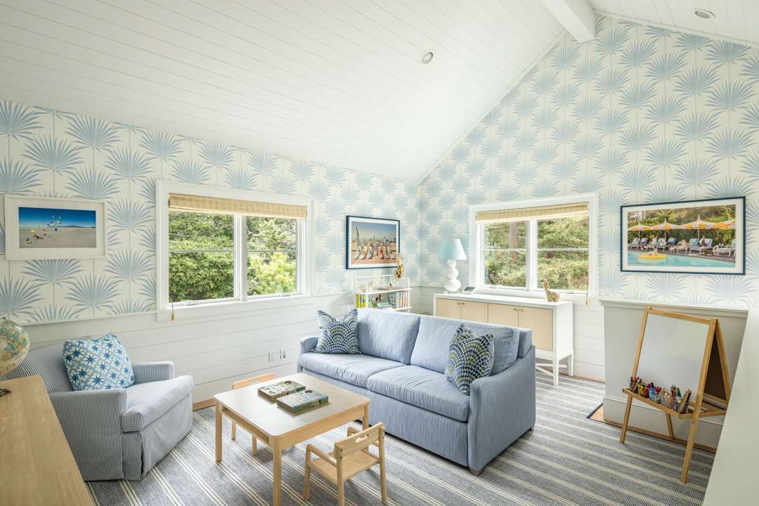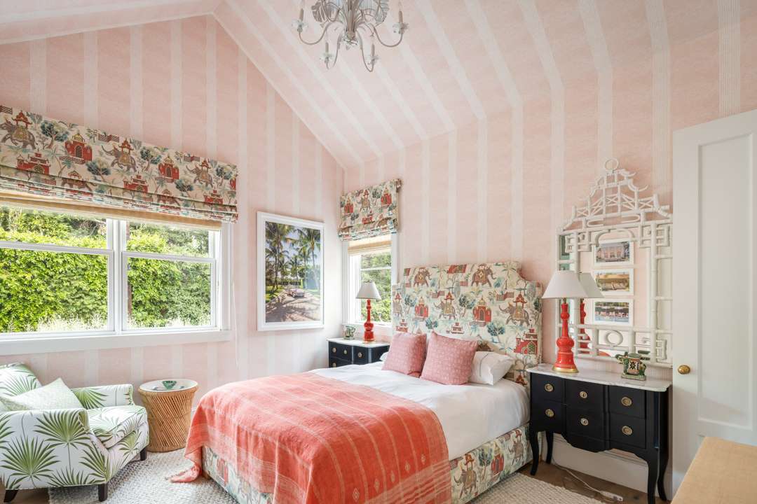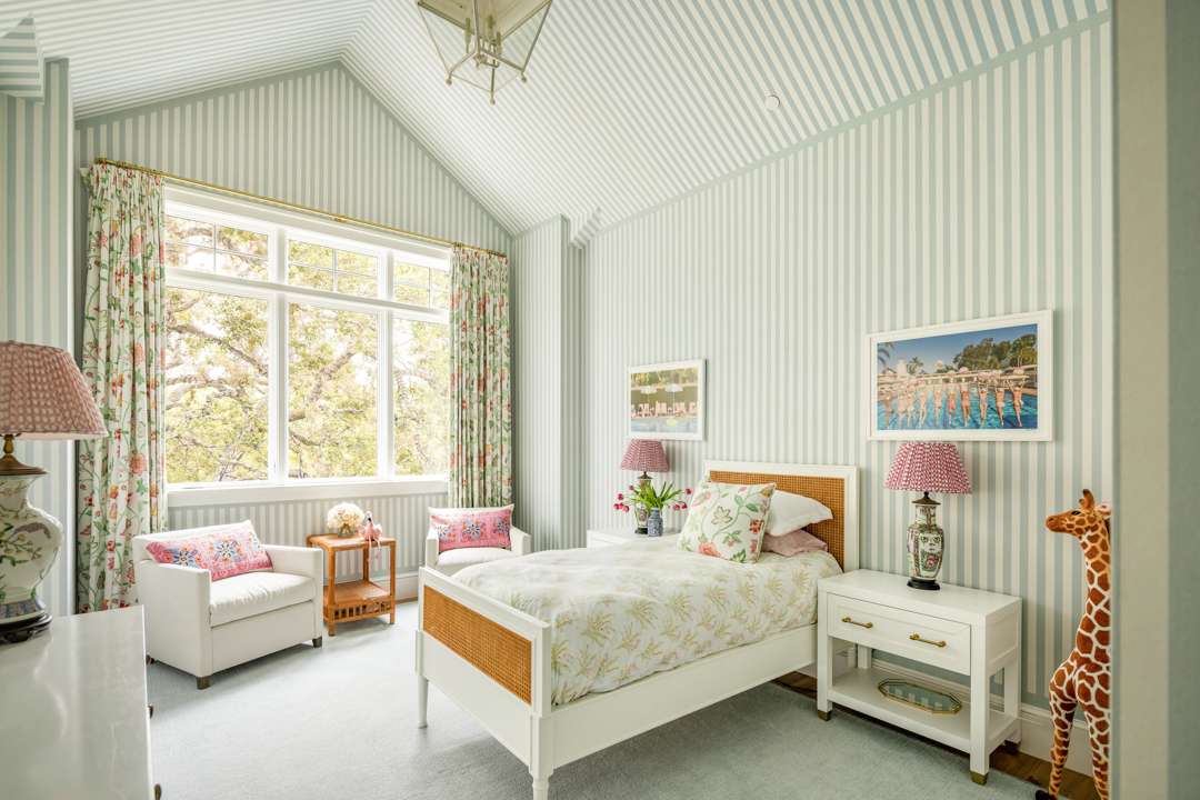Malin shared that there is a lot of symmetry throughout the home, much like in his photographs. Of course, various pieces of Malin’s work adorn the walls. Pretty wall coverings are also featured throughout, notably a striped blue bedroom with a starry wrapped ceiling, a pink-patterned bedroom, and a blueprint in the primary bath. Many playful yet elegant elements weave through the home, which totals 6,652 square feet with five bedrooms and six bathrooms.