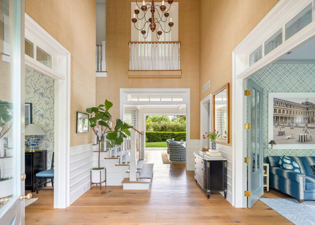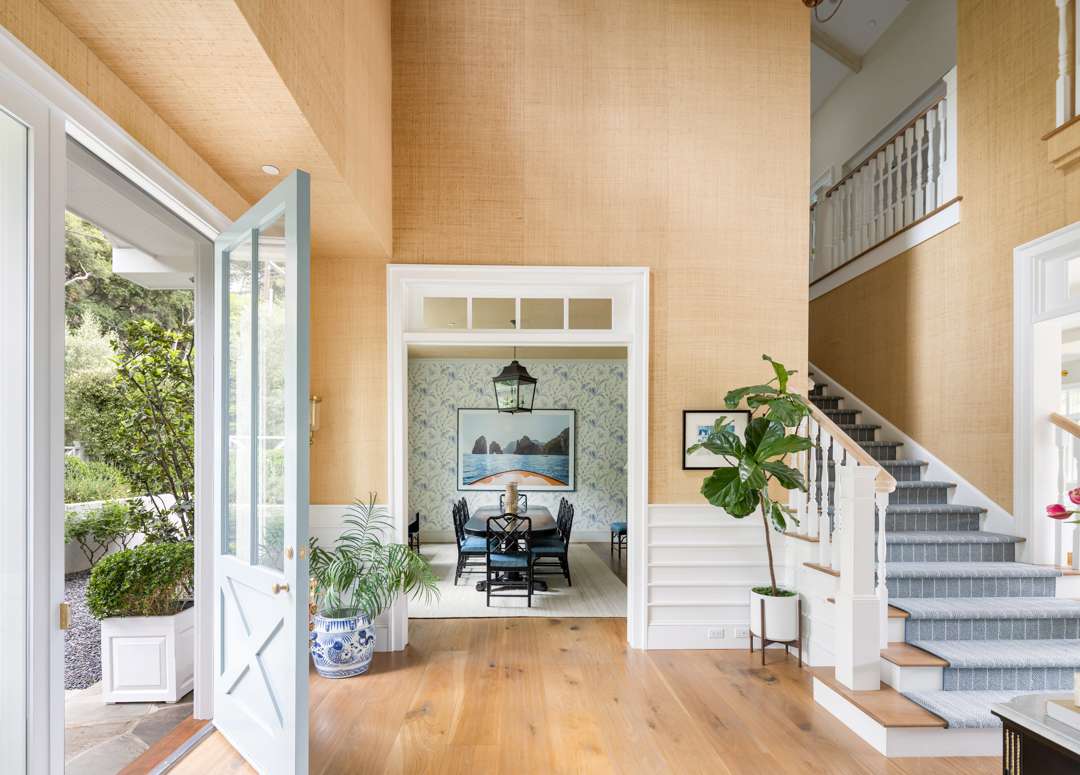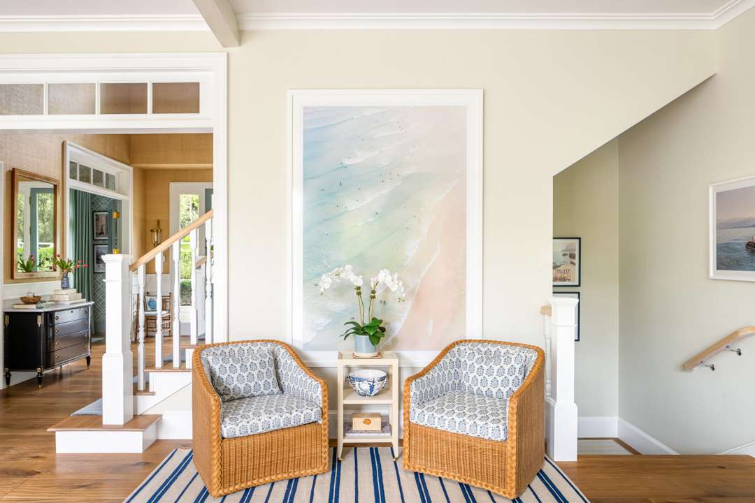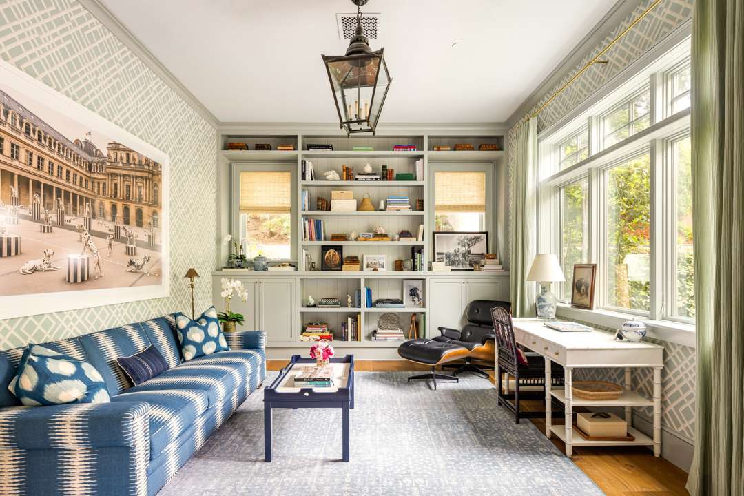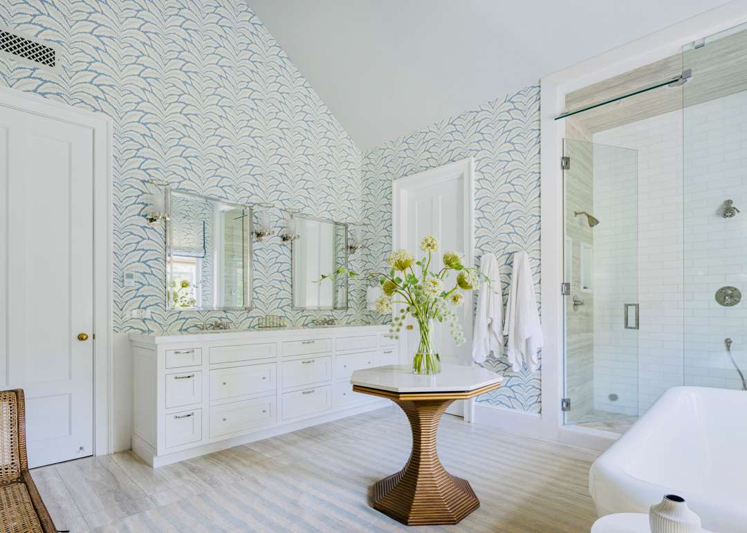 Malin shared that there is a lot of symmetry throughout the home, much like in his photographs. Of course, various pieces of Malin’s work adorn the walls. Pretty wall coverings are also featured throughout, notably a striped blue bedroom with a starry wrapped ceiling, a pink-patterned bedroom, and a blueprint in the primary bath. Many playful yet elegant elements weave through the home, which totals 6,652 square feet with five bedrooms and six bathrooms.