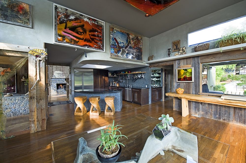 The interiors range from dark and moody to bright and natural, a nod to the artist’s unique point of view. Beyond the surface of the intriguing décor, the home contains secrets and surprises in its walls. Some paintings are actually disguised doors that open to closets and secret bedrooms.