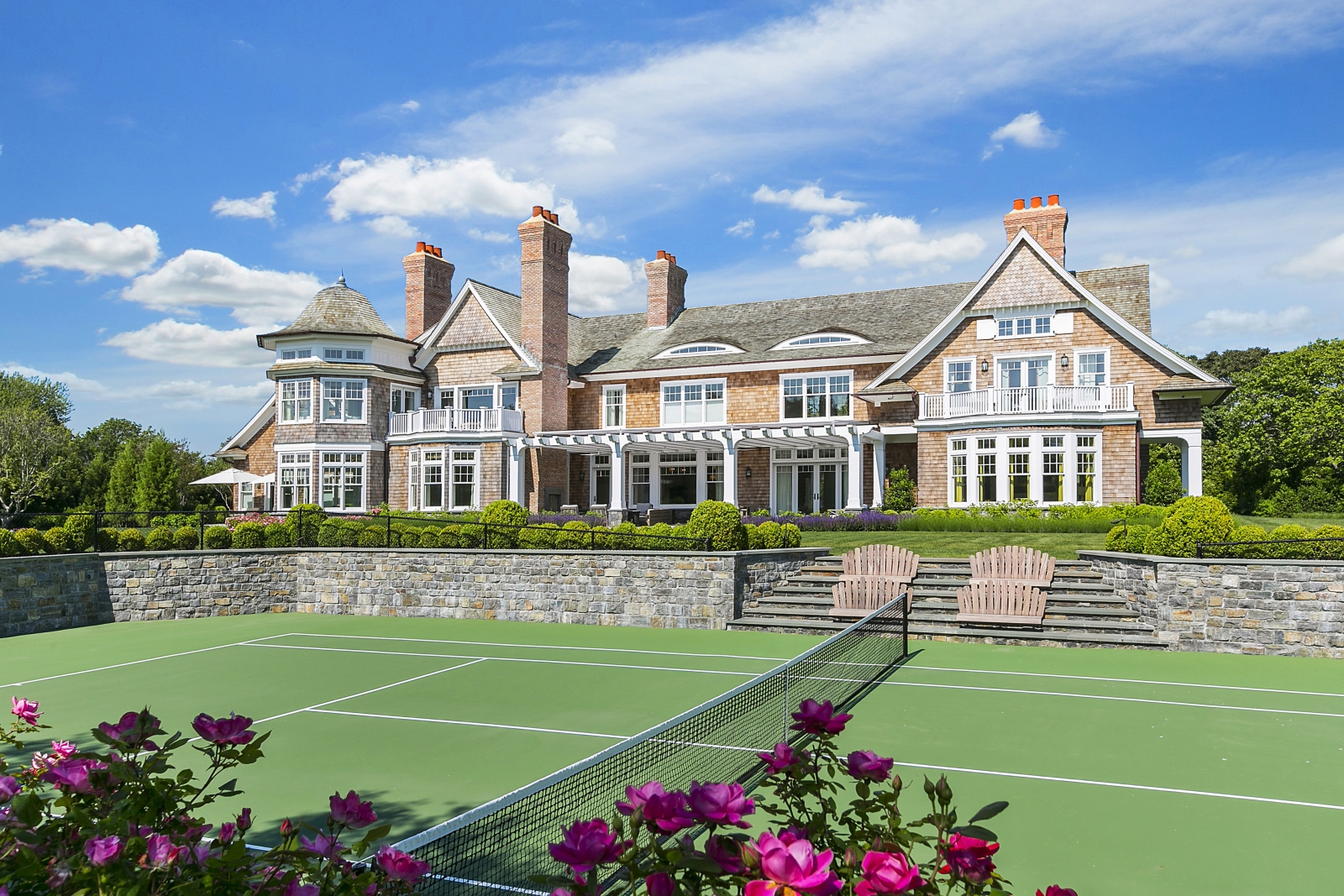 Luxurious features welcome the buyer, including a 60-foot-by-30-foot heated gunite pool, sunken all-weather tennis court, wine cellar, home theater, dance studio and an elevator. Private beach access sweetens the deal even more.