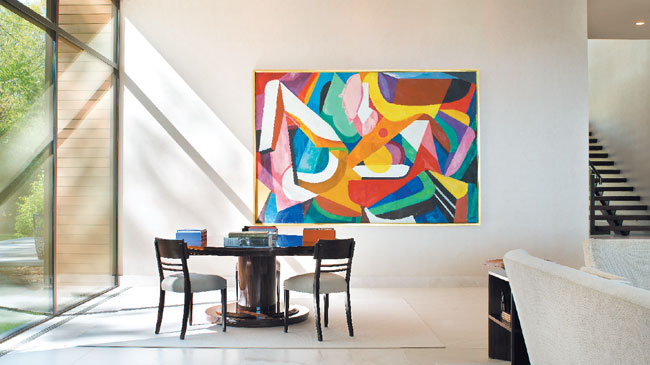 In the great room, James Daugherty’s Altar to the Unknown God hangs above a table from Antiqueria Tribeca and chairs from Jean-Marc Fray.