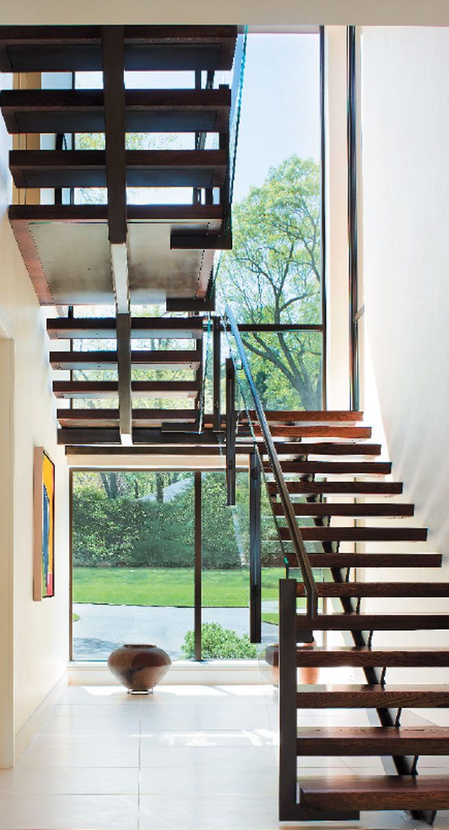 A beer vessel from Zambia rests below sculptural rosewood stairs that add drama to the home’s entry.