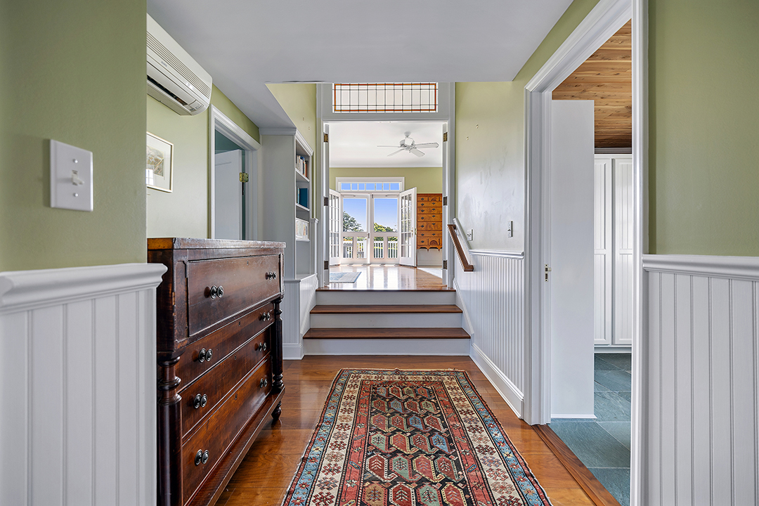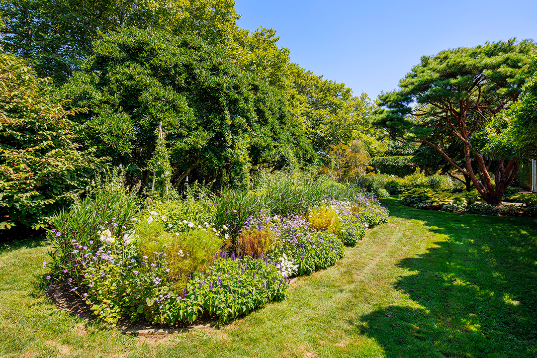 Its outdoor spaces are also a delight thanks to the abundance of balconies, terraces, and pathways. Everything looks out to the neat lawn and idyllic landscaping including mature cypress trees, umbrella pines, and cryptomeria trees as well as flowering perennial gardens. Peeks of the ocean further bolster the property’s wonderful sense of place.