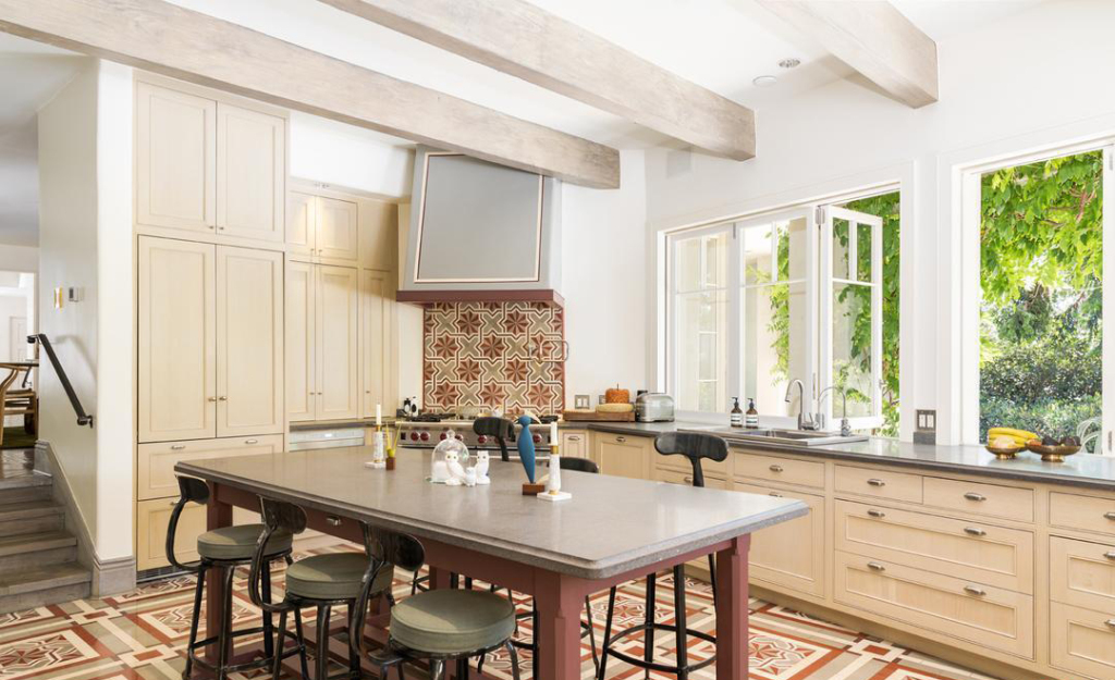 Eye-catching tiles and soft natural light infuse effortless tranquility into the spacious kitchen.