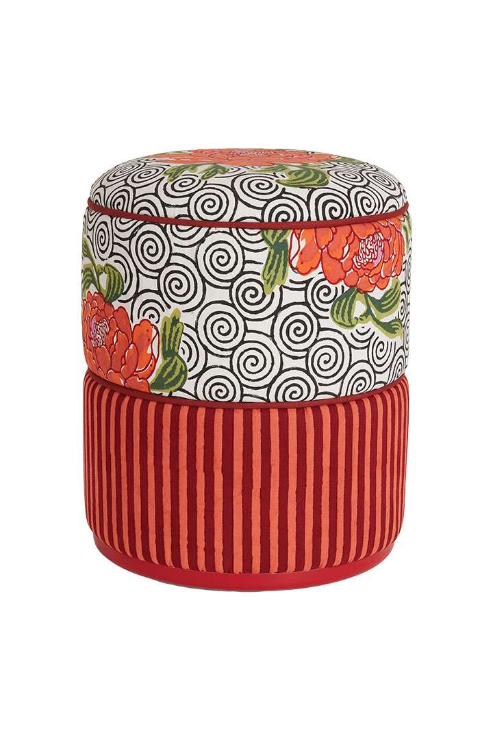 Lisa Corti’s creations bring together centuries-old craftsmanship and contemporary design, weaving stories of travel, culture and color into every piece. Her poufs exemplify this philosophy. Designed in Milan, they are upholstered in fabrics that are hand-block-printed by Indian artisans, where carved wooden blocks press pigments onto cotton in layers of bold florals, arabesques, or rhythmic stripes. Each print carries the irregular beauty of the human hand, transforming utility into artistry.