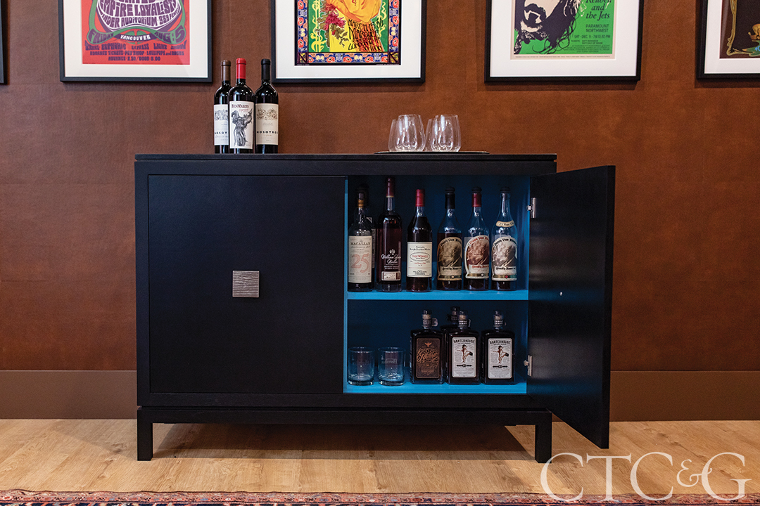 He also wanted acoustical separation from the rest of the house and, as the room is located at the far end of the basement, it required its own mechanical system. Our solution was to design a custom credenza that included a mini split system, a humidifier, an air scrubber and a custom humidor. I don’t think we could have packed one more thing into it!