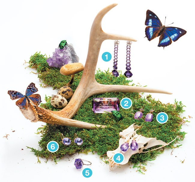 1. Kwiat gradient amethyst and diamond earrings set in 18k white gold. Price upon request, Mitchells, 670 Post Road East, Westport, 203-227-5165, Richards, 359 Greenwich Ave., Greenwich, 203-622-0551.