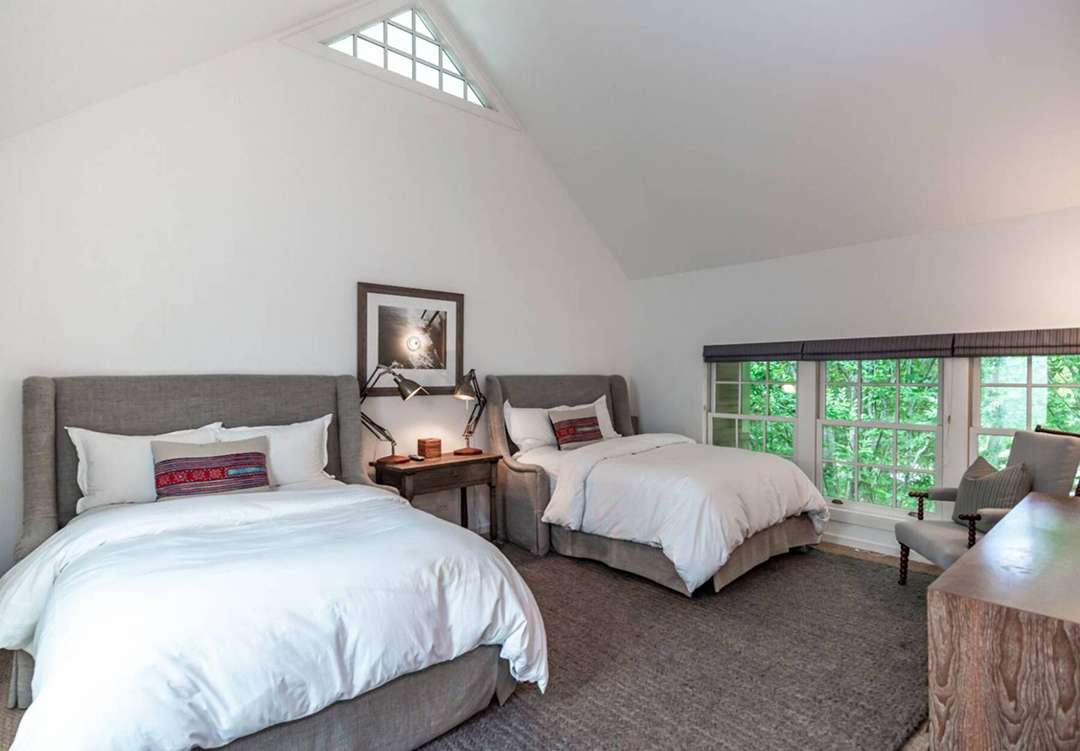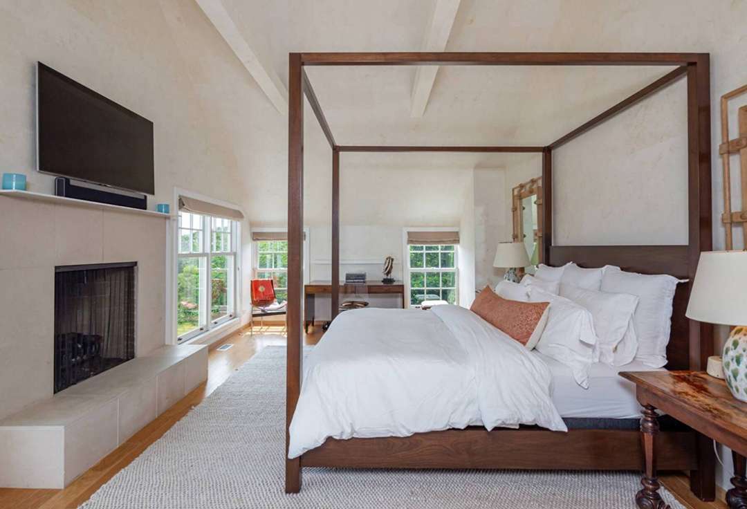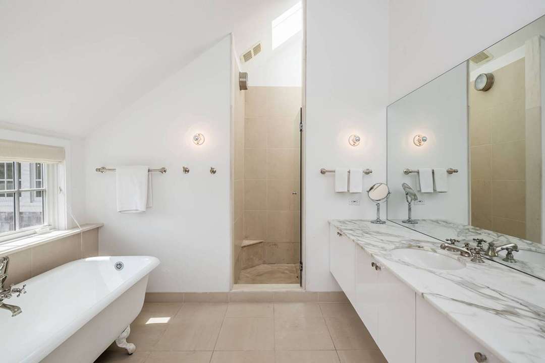 When it comes to the home itself, a new owner will gain 4,800 square feet of living space for sumptuous Hamptons hosting. The interior is bright and airy, especially the great room with floor-to-ceiling windows. The design by James D’Auria revolved around creating great open spaces, and the sellers have maintained his vision. An adjacent kitchen and dining room are modern and updated, anchored by a central island for easy entertaining. The first floor is mainly for entertaining, but holds one of the guest bedrooms. The primary suite and another three additional bedrooms sit on the second floor.