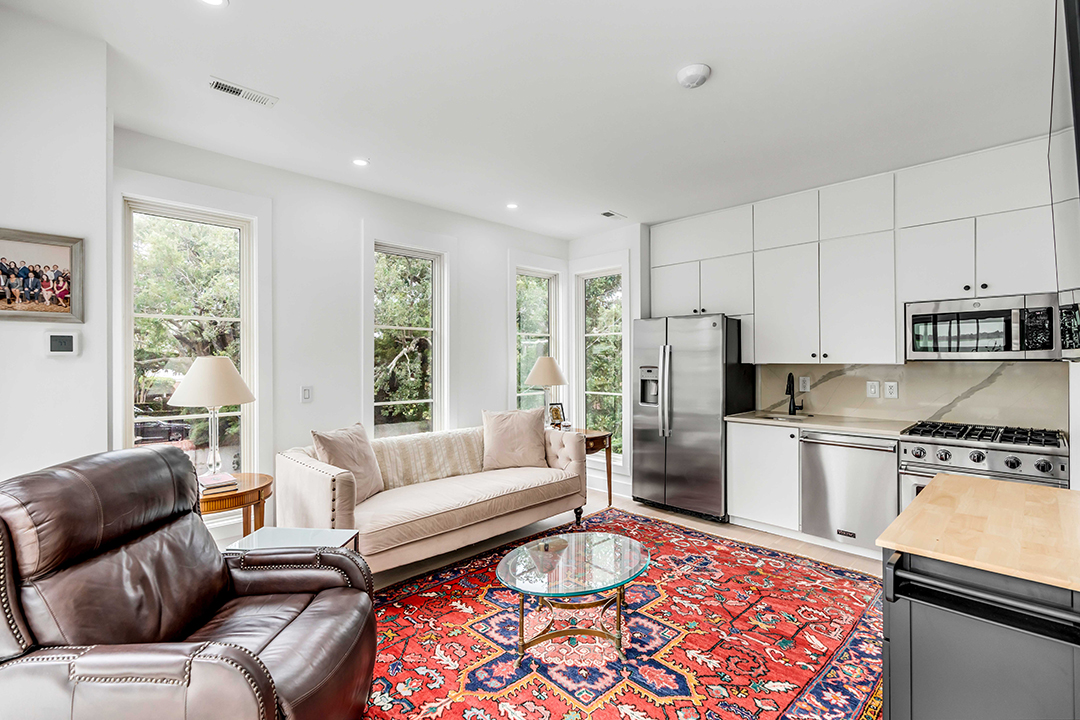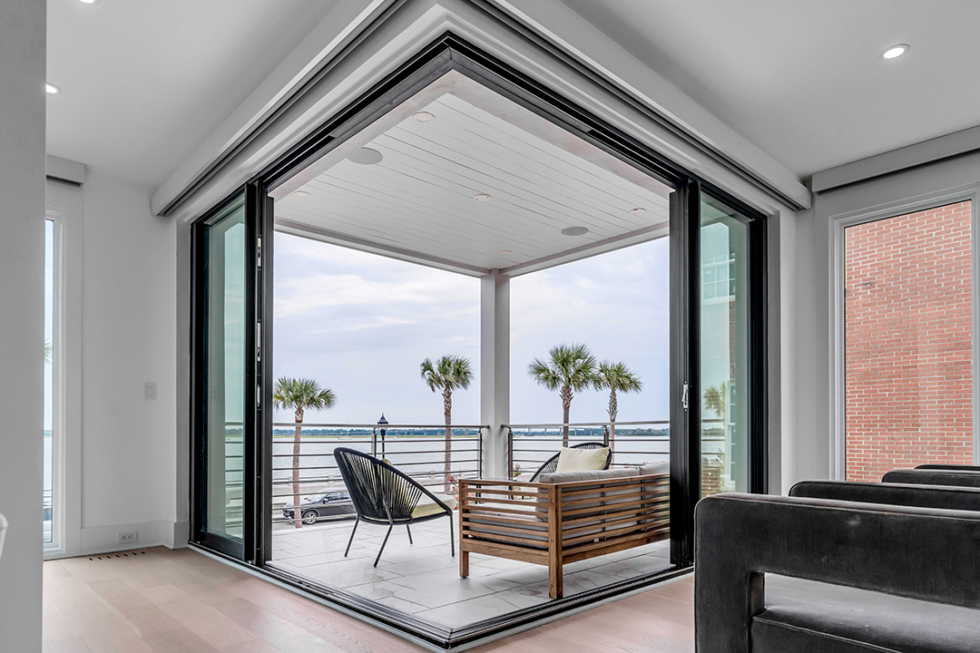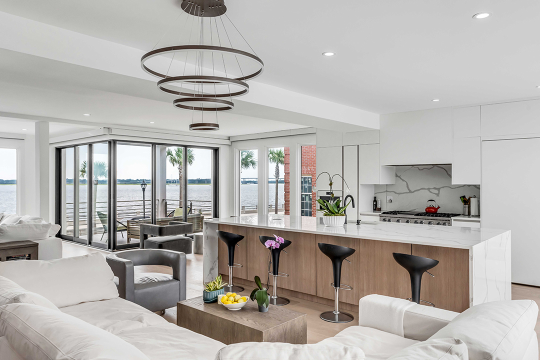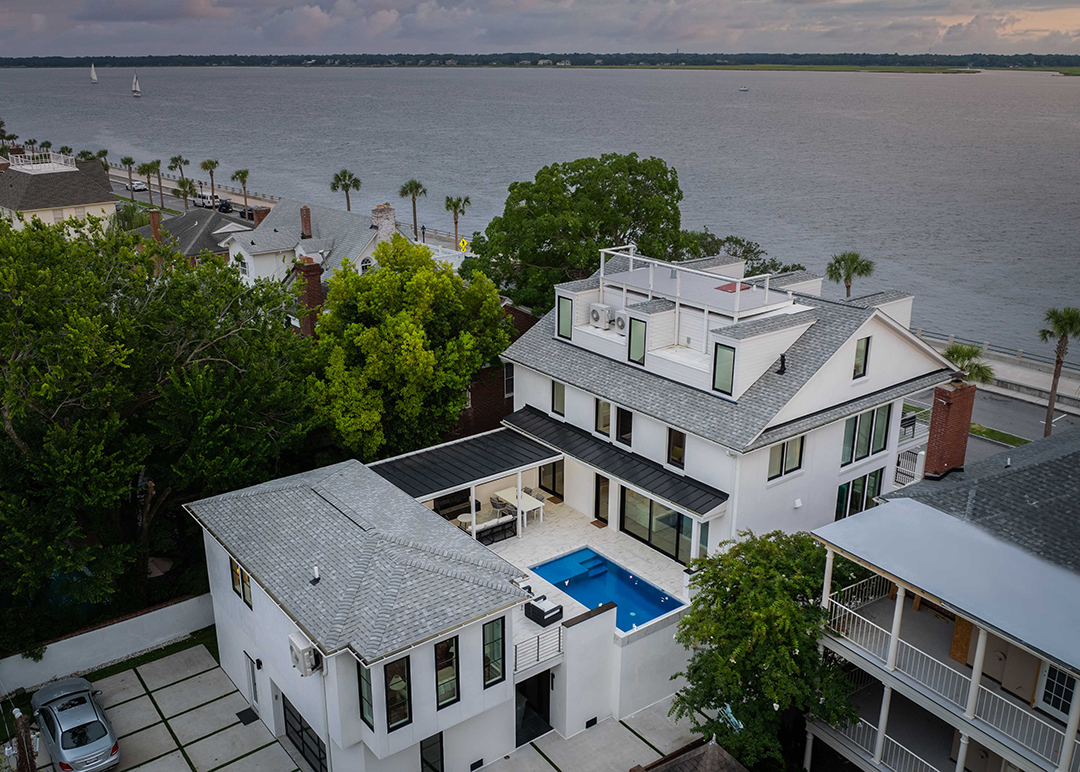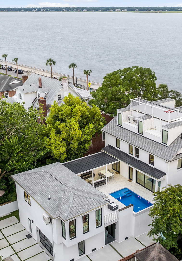 Of course, a perk of Charleston is the relatively warm weather that lingers throughout the year, so the variety of outdoor spaces are welcome sights. An elevated pool and grilling area, as well as water-facing terraces on the various levels, offer ample options for entertaining family and friends.