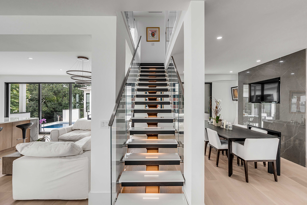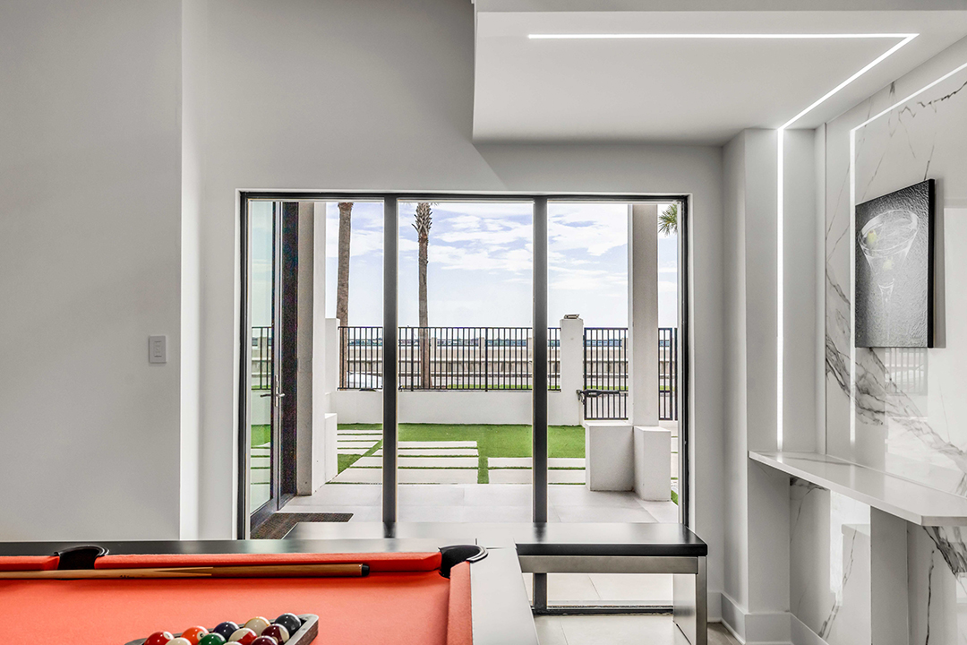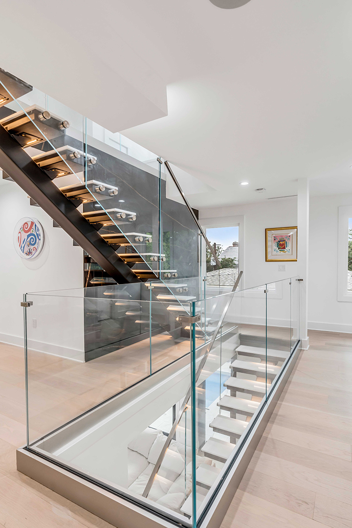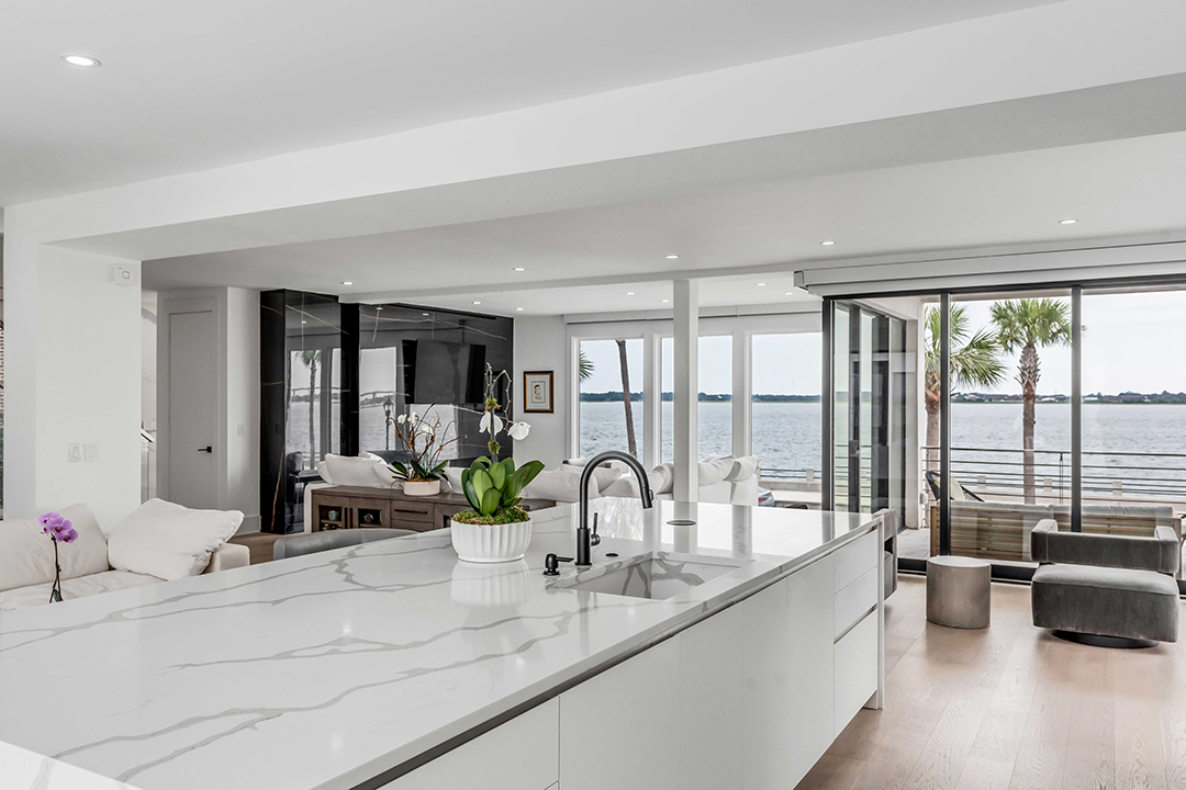 This waterfront three-story haven is ideal for a buyer who embraces the cleaner, more minimalist home style of today and wants plenty of space. The white stucco exterior mixes seamlessly with black windows, almost exuding more of an L.A. or Dallas vibe. Once inside the 6,755-square-foot modern, sleek lines, angular light fixtures, and marble panels continue to imbue a suave feel.