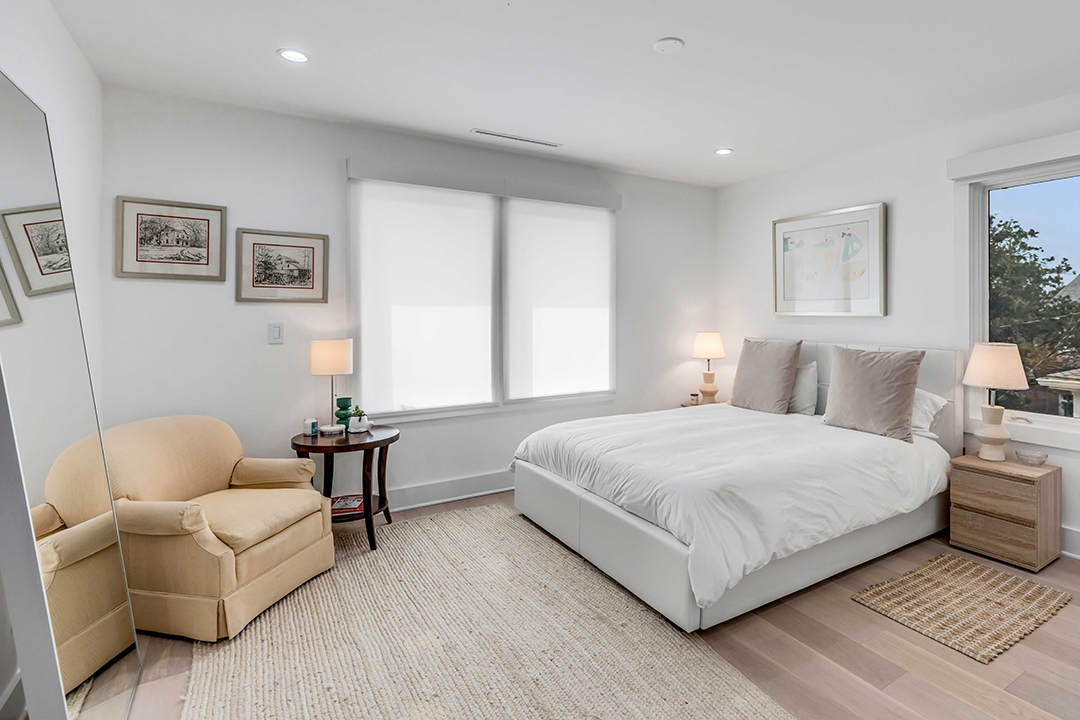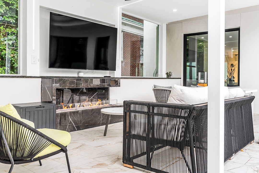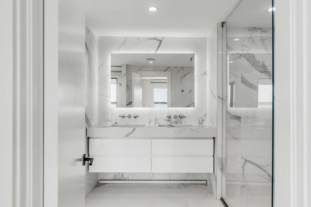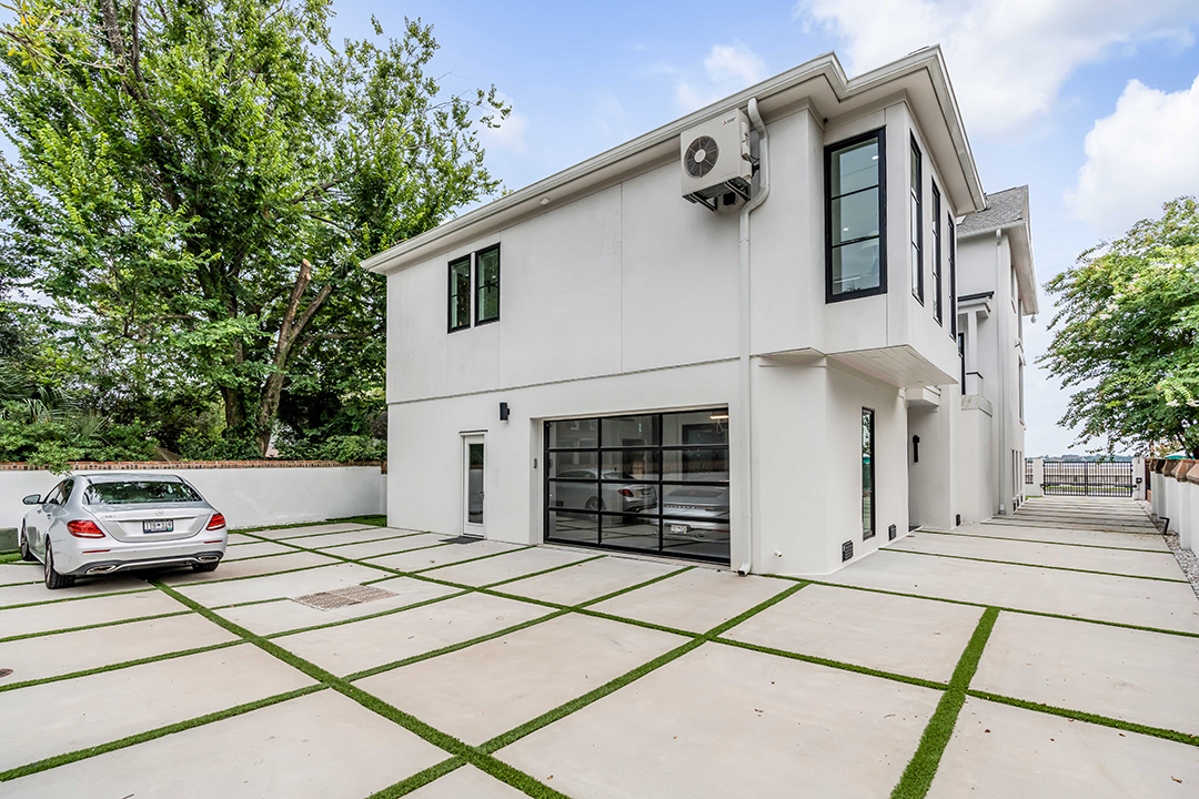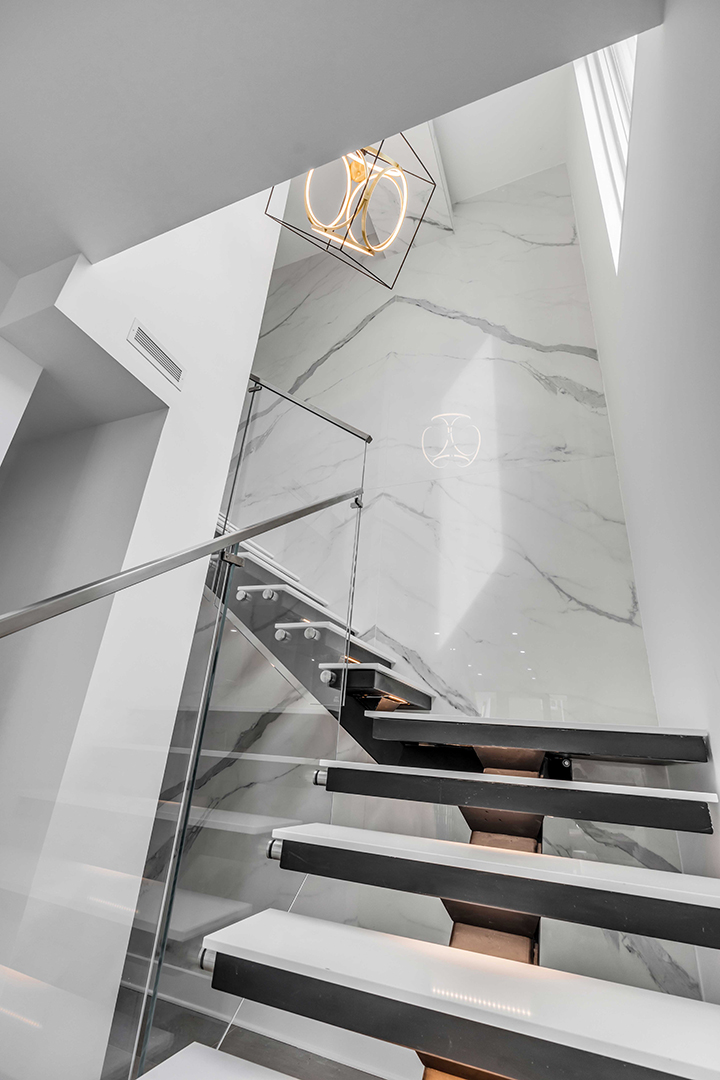 This waterfront three-story haven is ideal for a buyer who embraces the cleaner, more minimalist home style of today and wants plenty of space. The white stucco exterior mixes seamlessly with black windows, almost exuding more of an L.A. or Dallas vibe. Once inside the 6,755-square-foot modern, sleek lines, angular light fixtures, and marble panels continue to imbue a suave feel.