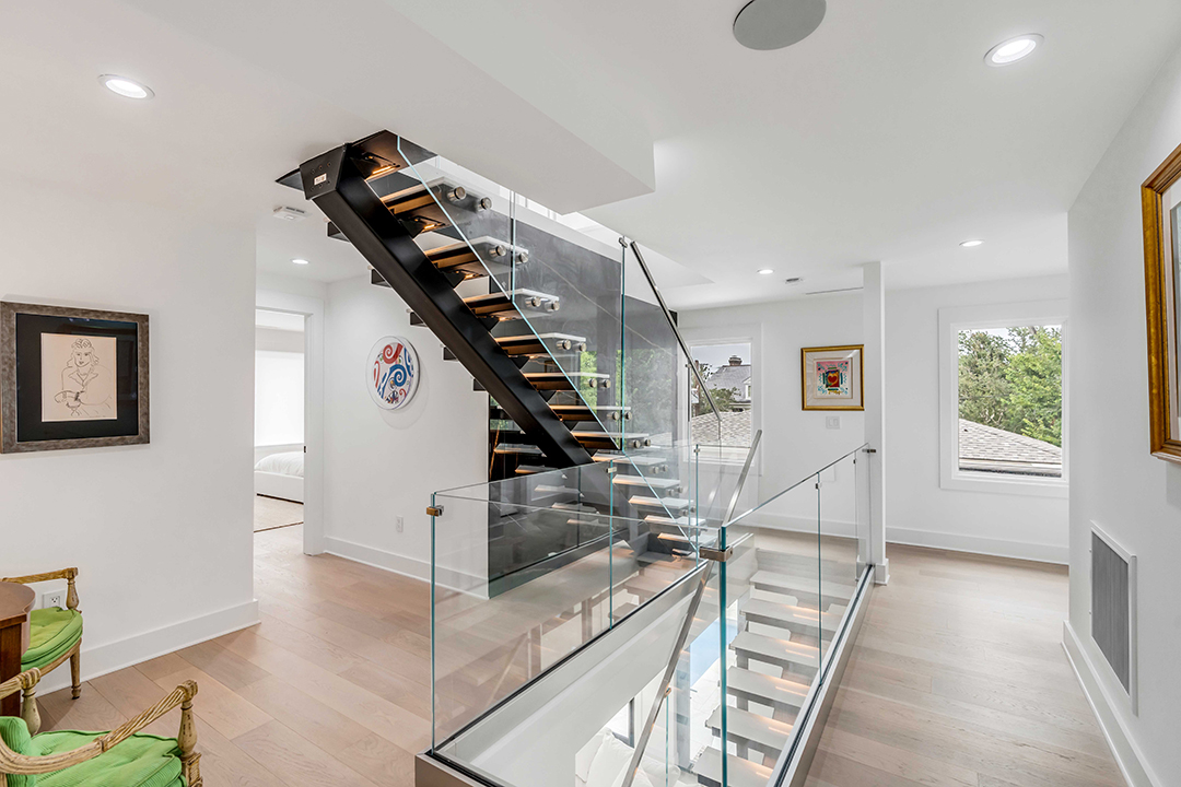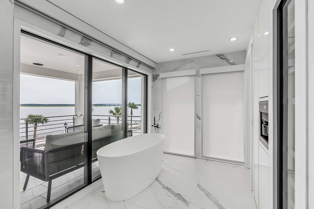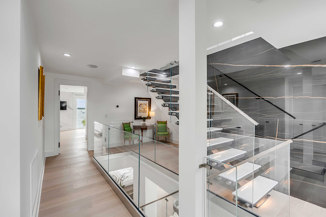 The kitchen is the star of the main floor, anchored by a waterfall quartz countertop and outfitted in Thermador and Viking appliances and custom Porcelanosa cabinetry. Adjacent to the kitchen are open living spaces, but what really draws your attention is the three-story floating glass staircase—quite literally walking on air. Ascending up the stairs will give way to four of the home’s five bedrooms, all of which capture lovely low-country views.