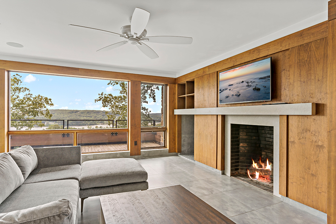 Jacobs designed this Lyme home for an architect/interior designer couple, aiming to make a residence that reflects the natural surroundings and protects the environment. It is equipped with a photovoltaic solar system that generates much of the electricity and a geothermal system that provides heating and cooling. The generous use of glass, stone and wood invites the outdoors in–particularly in the great room with its stone fireplace and glass wall with expansive views of the expansive patio and pool deck. The best “room” in the house, however, is the rooftop terrace with 360-degree views of the Connecticut River Valley.