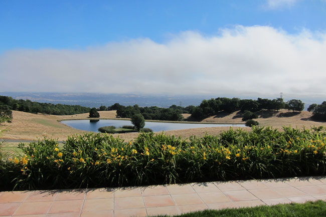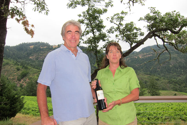 Just when I thought I was done with nature tours, my host of the Napa trip insisted I see one of Napa’s newest, steepest and most remote vineyards on the western slopes of Spring Mountain in the Mayacamas range. We took the trip up in heavy-duty four-wheel-drive vehicles to Hidden Ridge Vineyard. Lynn Hofacket and Casidy Ward, a married couple from Oklahoma, cultivate Cabernet Sauvignon in vineyards on mountain slopes, some with a 55 percent slope, at elevations from 900 to 1700 feet. How relieved I was to arrive safely at the top where they had built a deck overlooking a rugged panorama of gnarled oak and Manzanita forest. They often camp out there. Then Casidy dropped the dreaded news that there are rattlesnakes there. When my summer tan turned white, she quickly added, “They don’t come on the deck.”