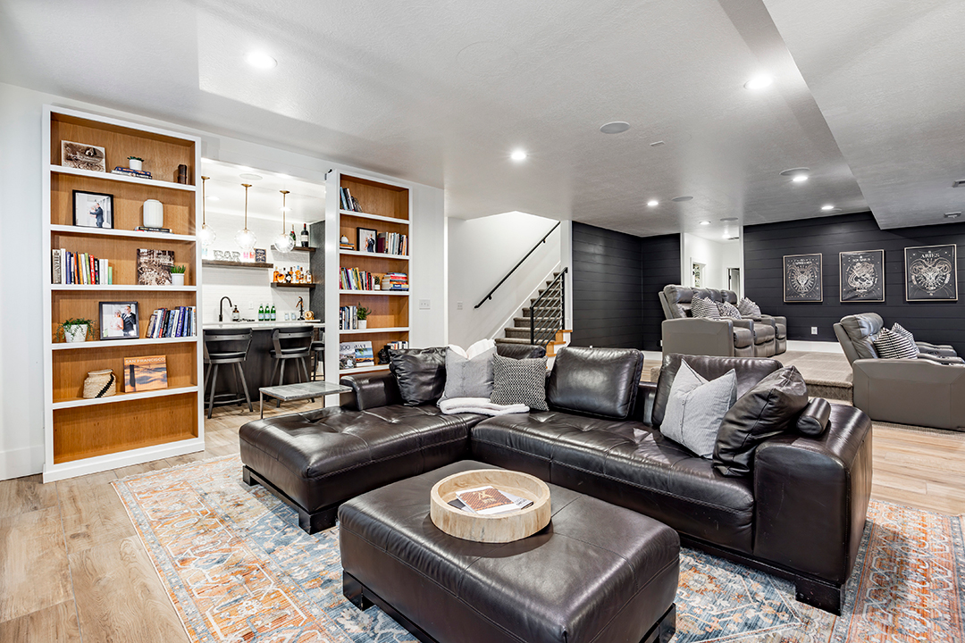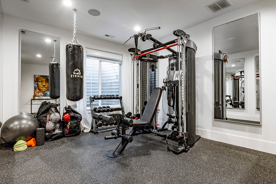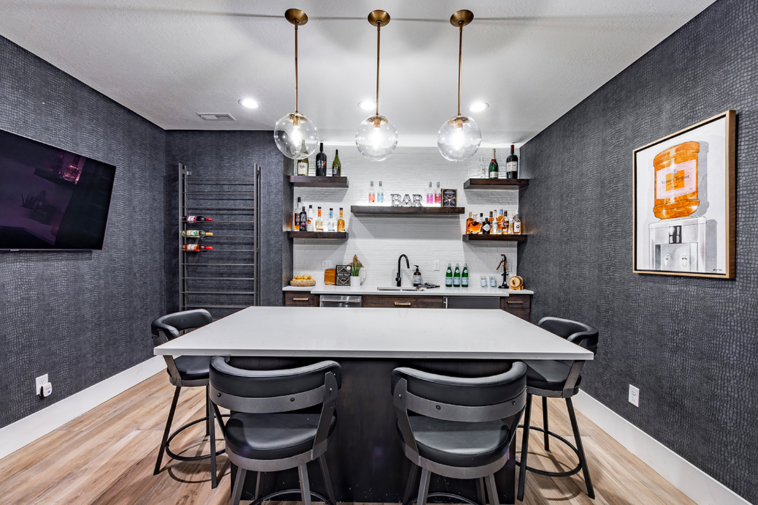 While the first floor’s open living spaces are ideal for entertaining, there’s no question that the basement was designed for unabashed fun. Behind sliding bookshelves, the speakeasy awaits on this level. There’s also a home theater, additional seating areas, and an exercise room with a sauna.