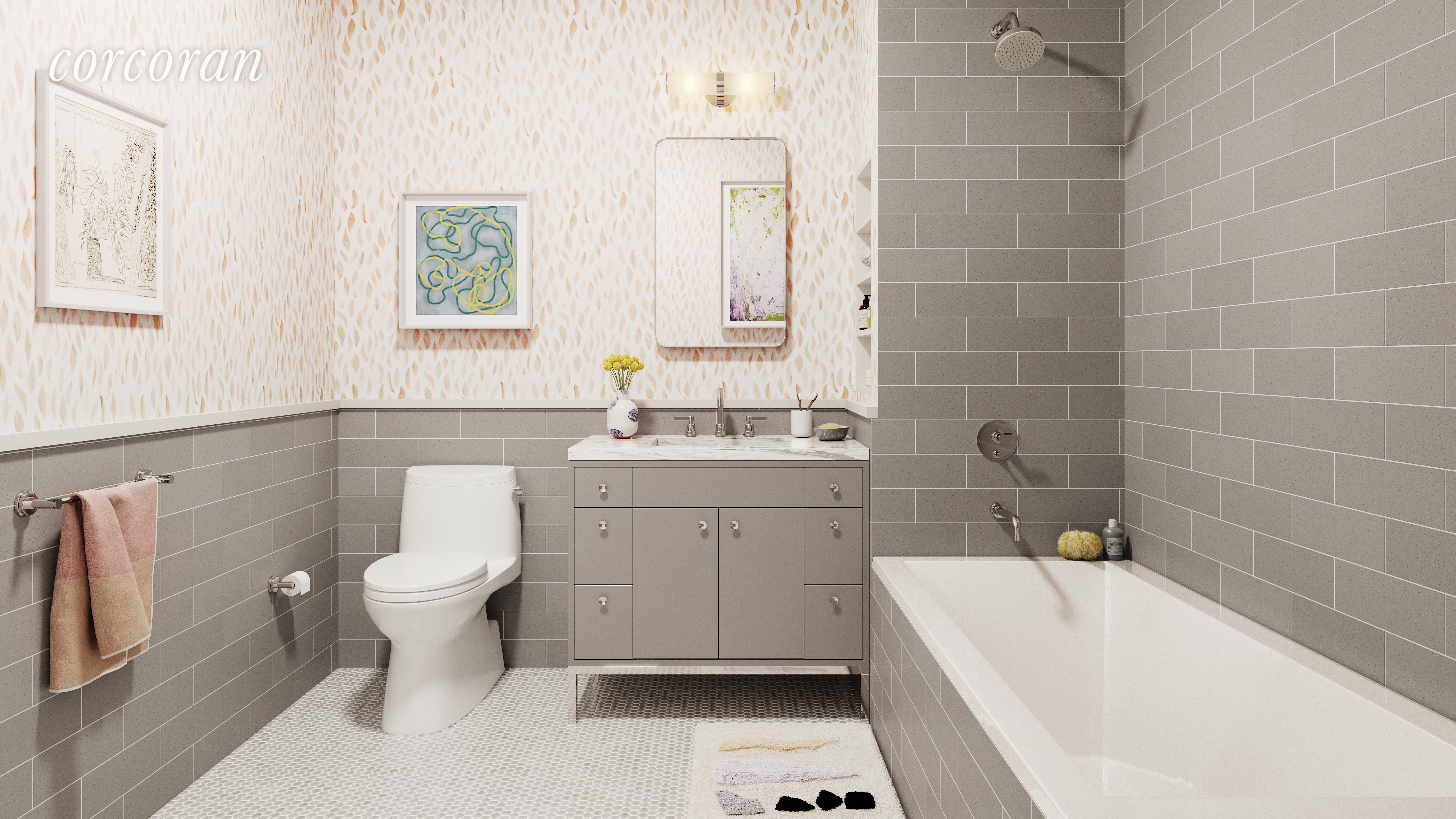 The apartment holds four bedrooms and three-and-a-half bathrooms, decked out in beautiful modern interiors. Upon entering the space, a foyer leads potential homeowners into an airy 26-foot living space, including a custom designed kitchen with white oak cabinets, Statuarietto marble islands, quartz countertops, and a Carrara marble backsplash. The master suite can be found on the western wing of the home, featuring heated flooring, a windowed marble-clad bath, and walk-in closet. The east wing holds the three additional bedrooms and two full baths.