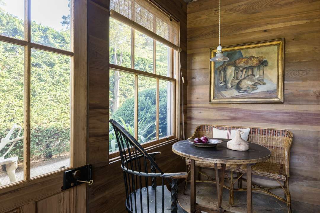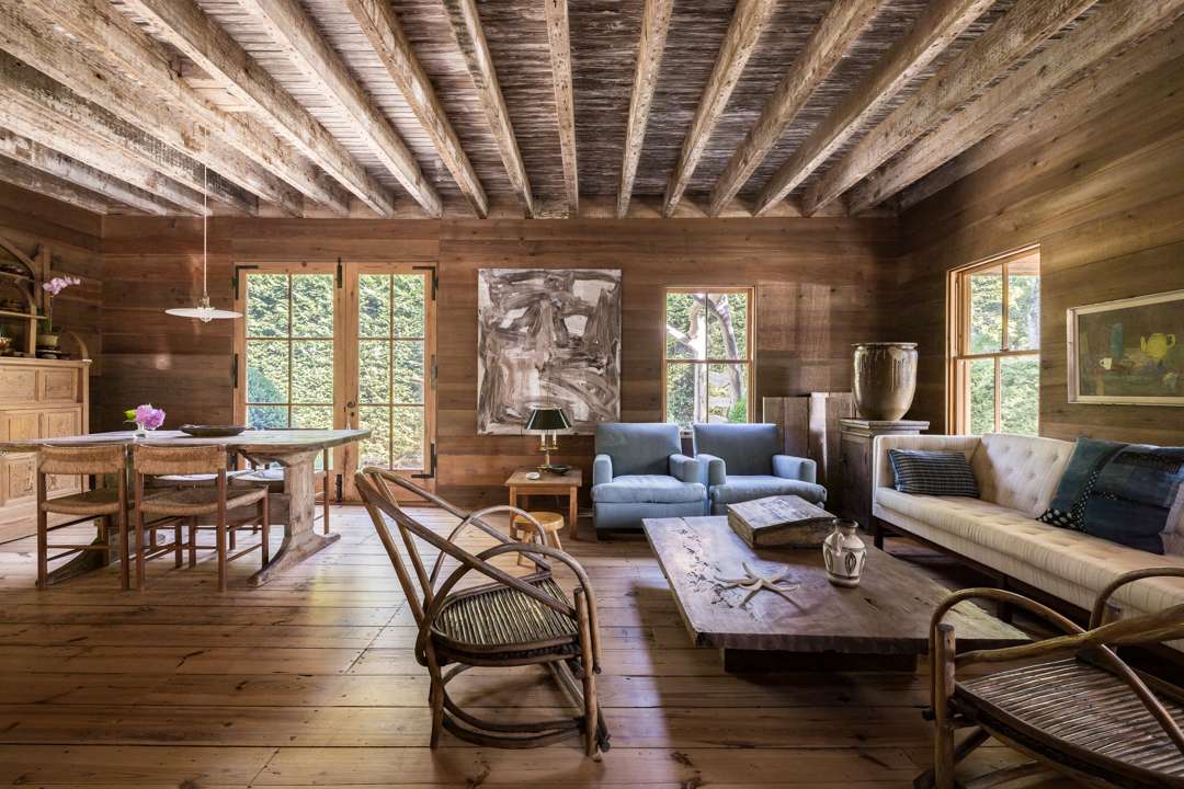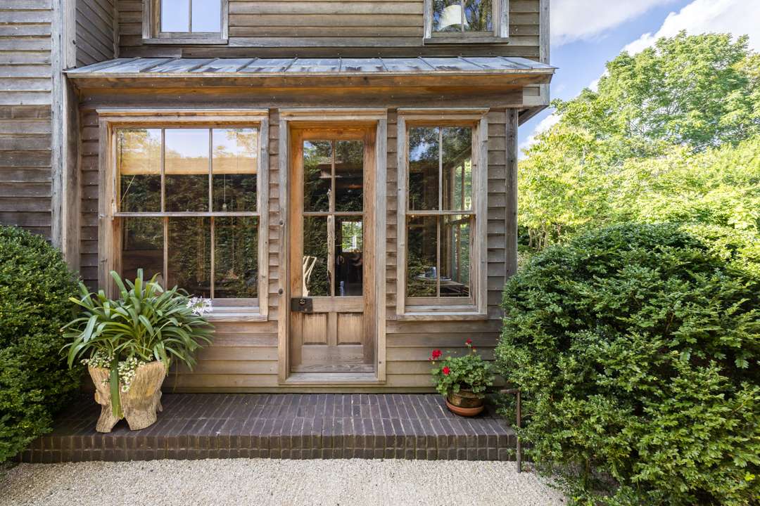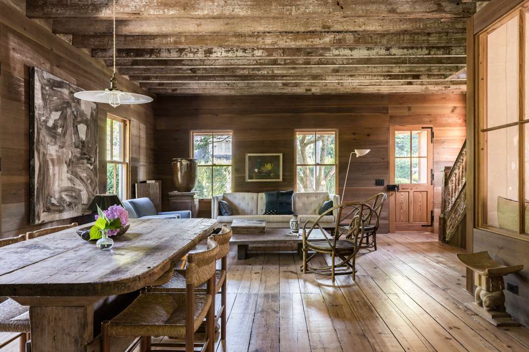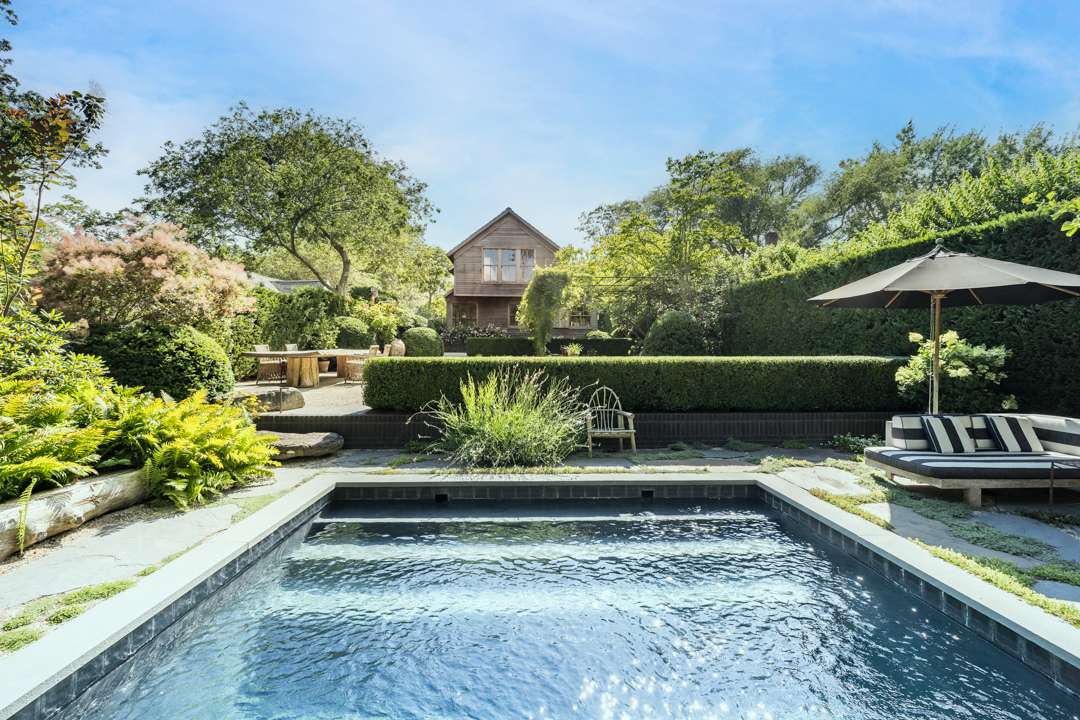The cozy 2,077-square-foot abode has three bedrooms and three bathrooms. Natural design elements distinguish the property—from the cedar exterior, to the wide-plank pine floors, antique ceiling beams, and treated pine walls. A serene, earthy palette throughout creates a seamless dialogue between old and new. Outside, a lush yard with a gunite swimming pool awaits.