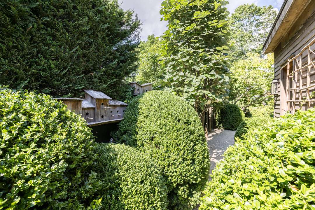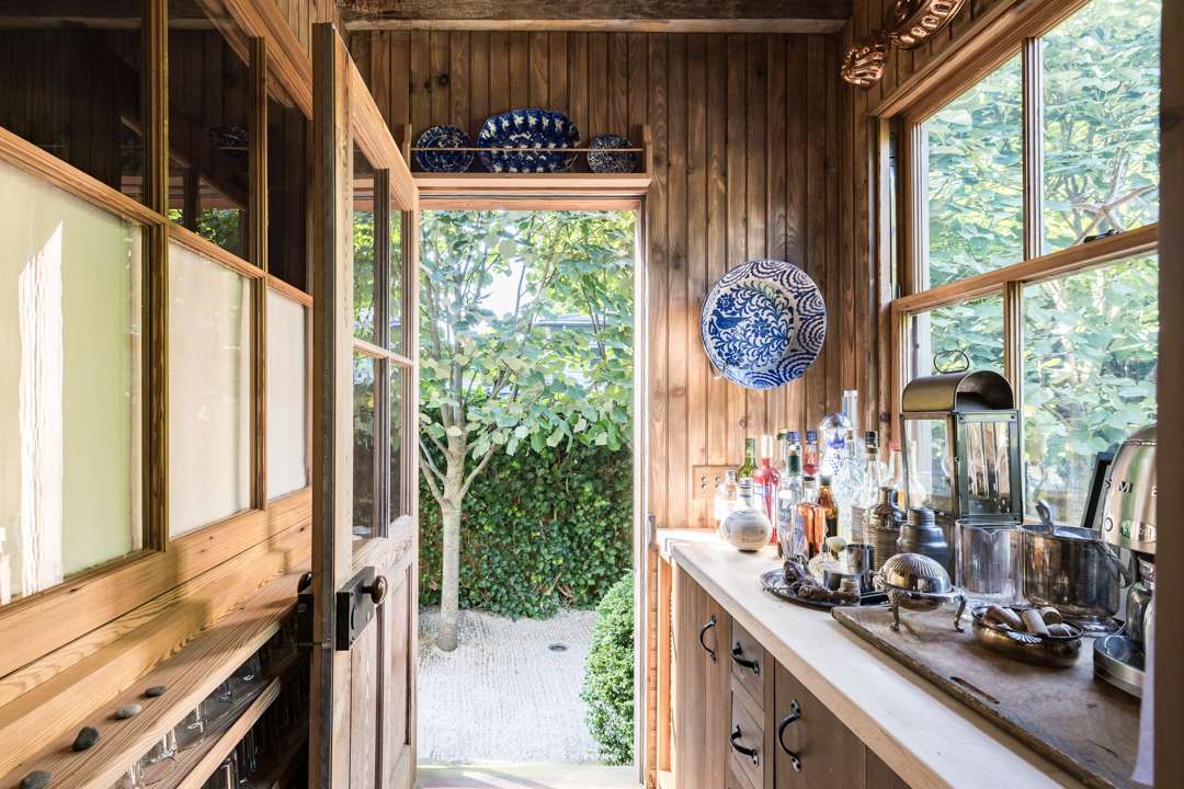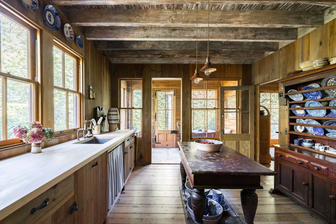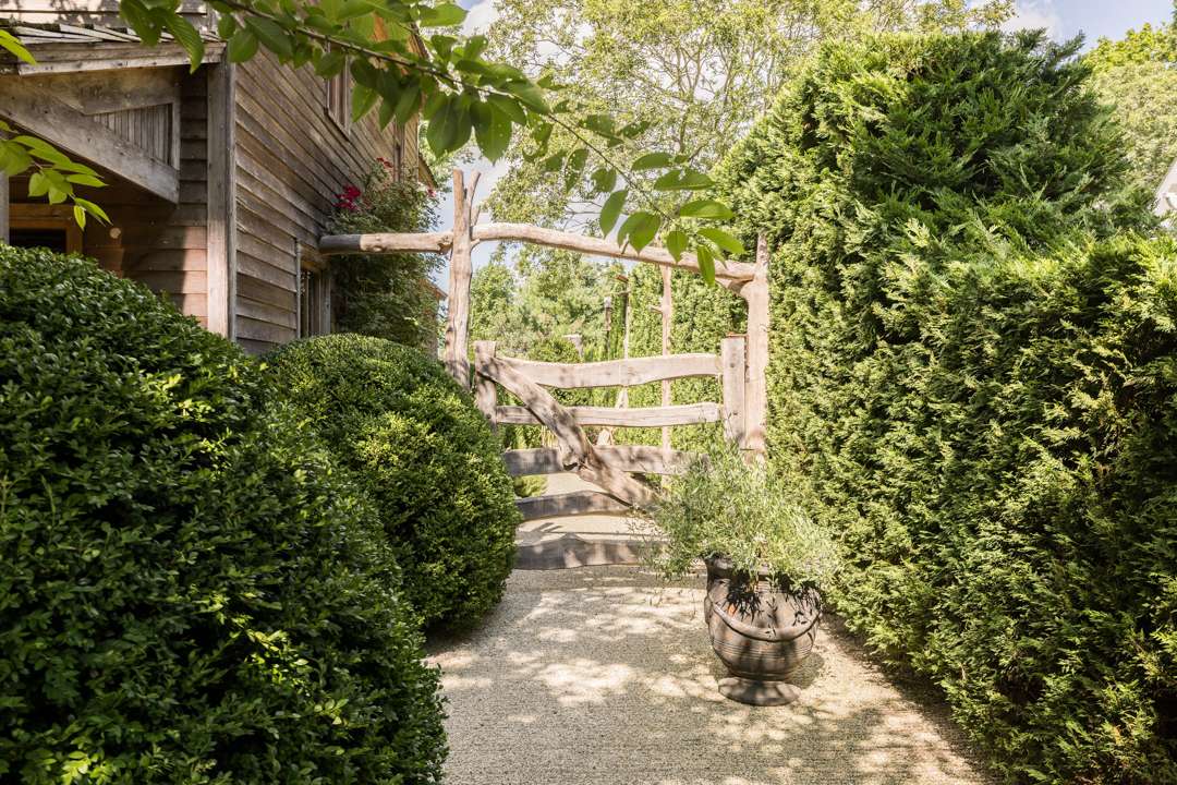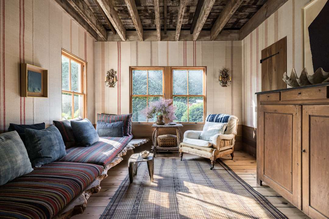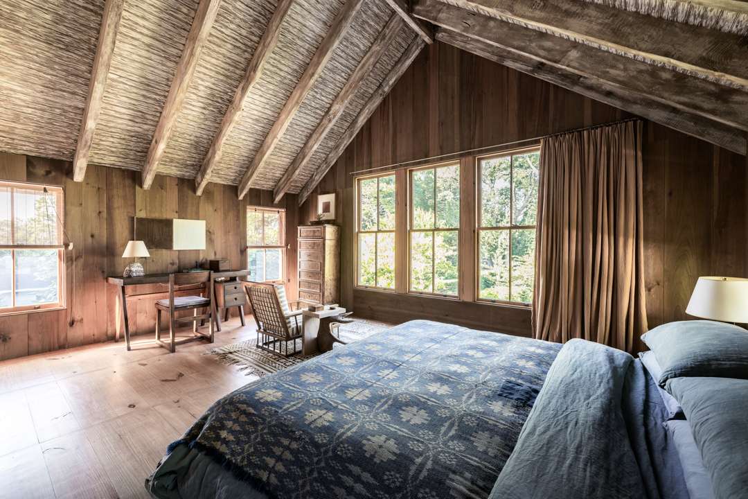 The cozy 2,077-square-foot abode has three bedrooms and three bathrooms. Natural design elements distinguish the property—from the cedar exterior, to the wide-plank pine floors, antique ceiling beams, and treated pine walls. A serene, earthy palette throughout creates a seamless dialogue between old and new. Outside, a lush yard with a gunite swimming pool awaits.