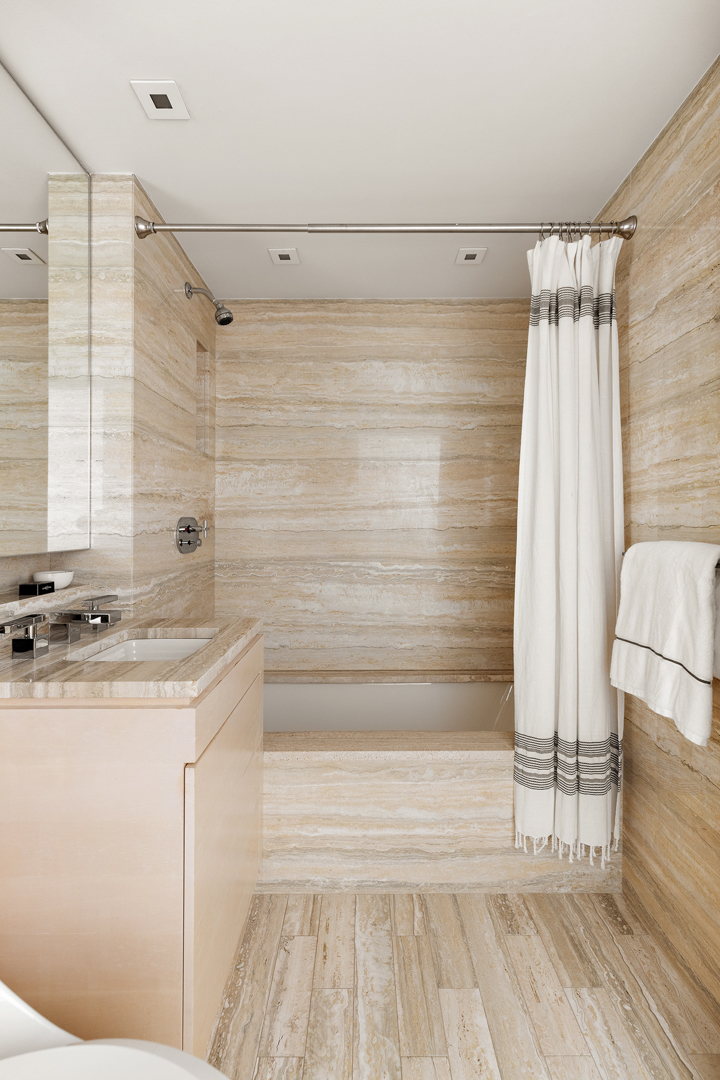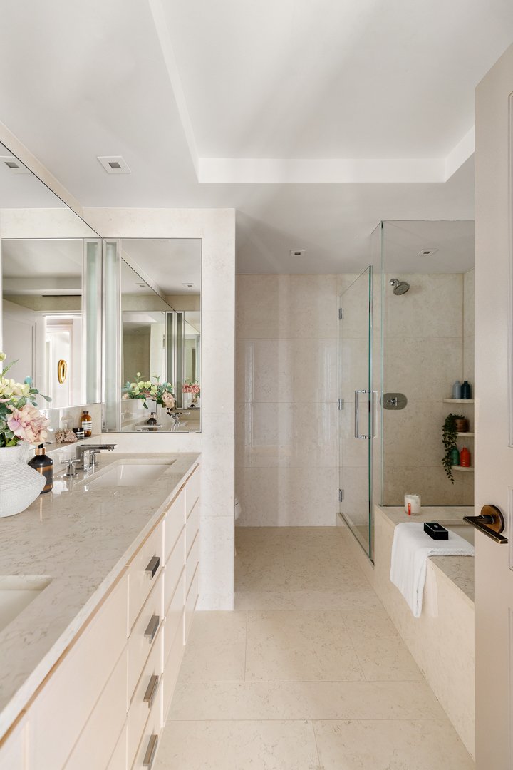 Taking the elevator up to the seventh floor, this stylish residence totals 3,147 square feet, with four bedrooms, four full bathrooms, and one powder room. Floor-to-ceiling windows with southern exposures complete all the major spaces, while the current design choices bring personality with abundant artwork and furnishings that display a mix of shapes and textures. You can find interesting pieces in the the 28-foot-long living/dining room, for example, or the library. The groovy, contemporary-style kitchen was designed by Marino and is outfitted with Swiss quartzite countertops and top-of-the-line appliances by Sub-Zero, Wolf, and Miele. Finally, the unit boasts not one, but two primary suites—each with its own ensuite bath and walk-in closet.