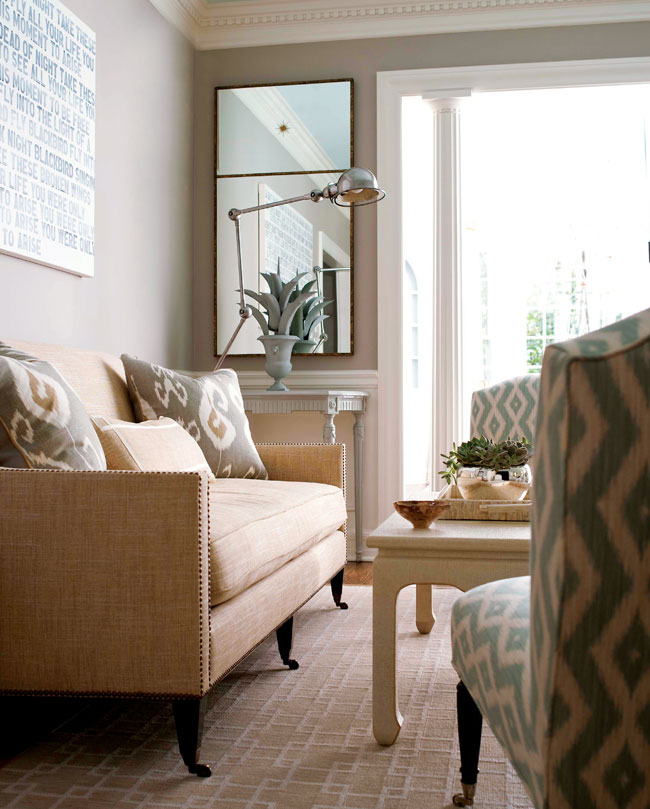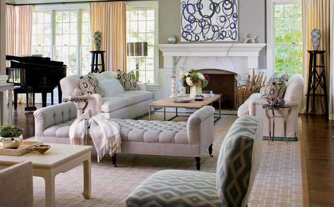 Pretty in Pale | In the living room, a custom-made tufted bench is covered in Barbara Barry’s Rustico linen, the two sofas in Skye Linen from Osborne & Little. Slipper chairs are covered in Kravet’s Ikat Diamond. The Van Thiel and Co. coffee-table top is fashioned from reclaimed parquet. Vintage lamp is from Dovecote. The painting is by New Orleans artist Amanda Stone Talley.