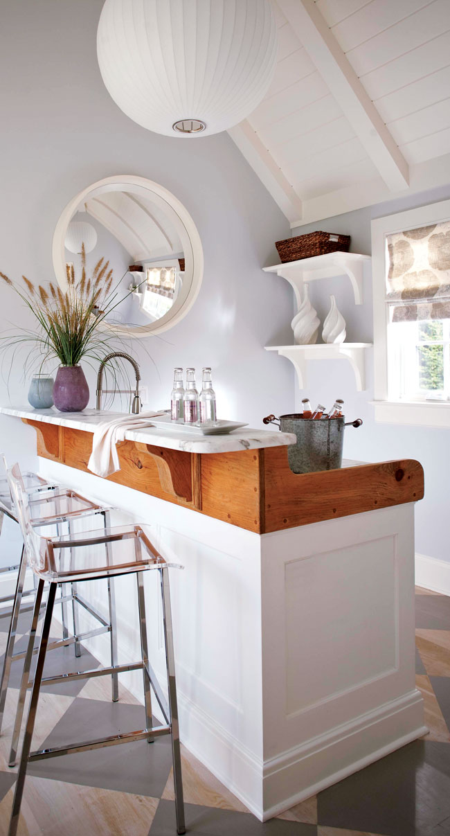 Making a Splash | In the new pool house, three Lucite-seated Vapor stools from CB2 cozy up to a custom-made bar; the mirror is Mitchell Gold+Bob Williams, the fixture a George Nelson Ball Pendant from Design Within Reach.