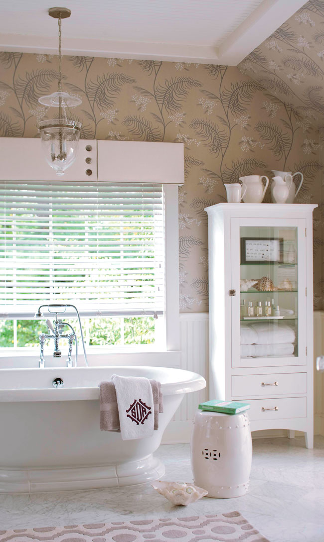 Soak It In | A Dash & Albert rug grounds the master bath, where the walls are covered in a Mimosa pattern from Cole & Son for Lee Jofa. The window cornice has a clever mother-of-pearl button detail. Monogrammed towels from Leontine Linens rest on a Kohler tub. The light (Martha Stewart), stool (Lillian August), and cabinet (Restoration Hardware) are stylish yet cost-effective accents.