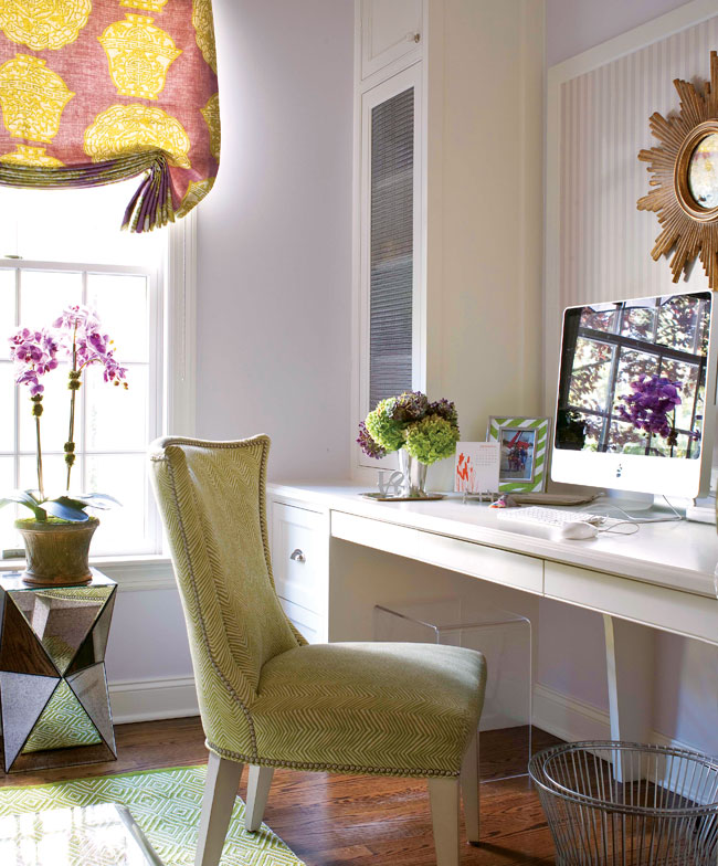 Blog Central | In Sue’s office, the shade fabric inspired the lavender and chartreuse palette. A Lee Industries chair is covered in Petit Zig-Zag from Quadrille’s China Seas collection.