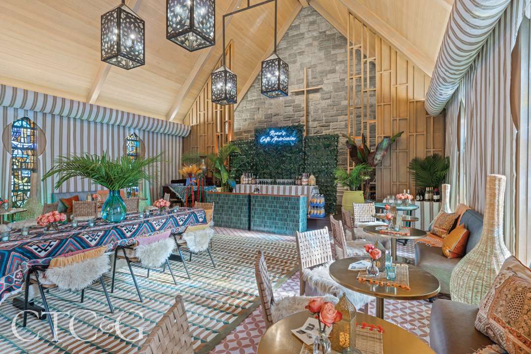 “The Hadley Cafe was converted into ‘RWAV’s Café Américain.’ We took our inspiration from the souks and riads of Morocco all the while paying tribute to the movie Casablanca. With industry partners such as Knock on Wood Antiques, Scott Group Studio, Sanderson and Schumacher, we transformed the church’s chapel into a desert oasis right in the middle of Southport, Connecticut.”—Sydney Frazier, Sydney Frazier Interior Design and Victoria Vought, Victoria Vought Designs
