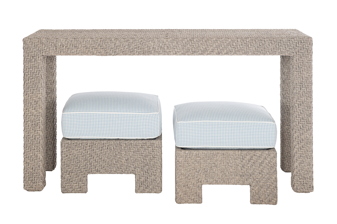 Introduced at the fall High Point market, Susan Hable’s outdoor collection for Hickory Chair arrives just in time for summer. The Yara console and Yara square stools are wrapped with a woven synthetic fiber in a Graystone colorway over a stainless-steel frame. Console, $4,197; stools, $2,505 each. Available through the Schwartz Design Showrooms.