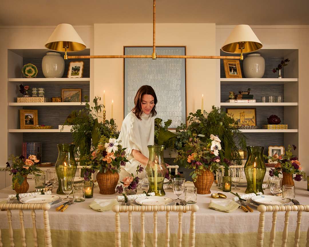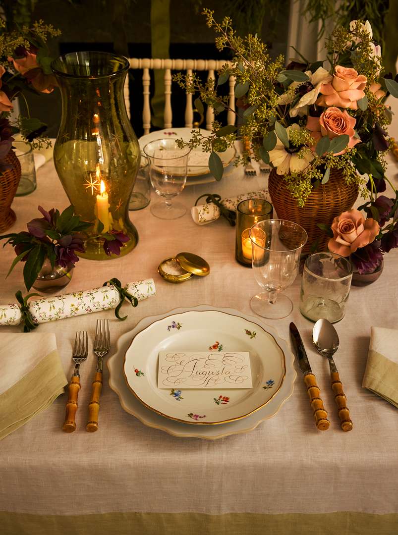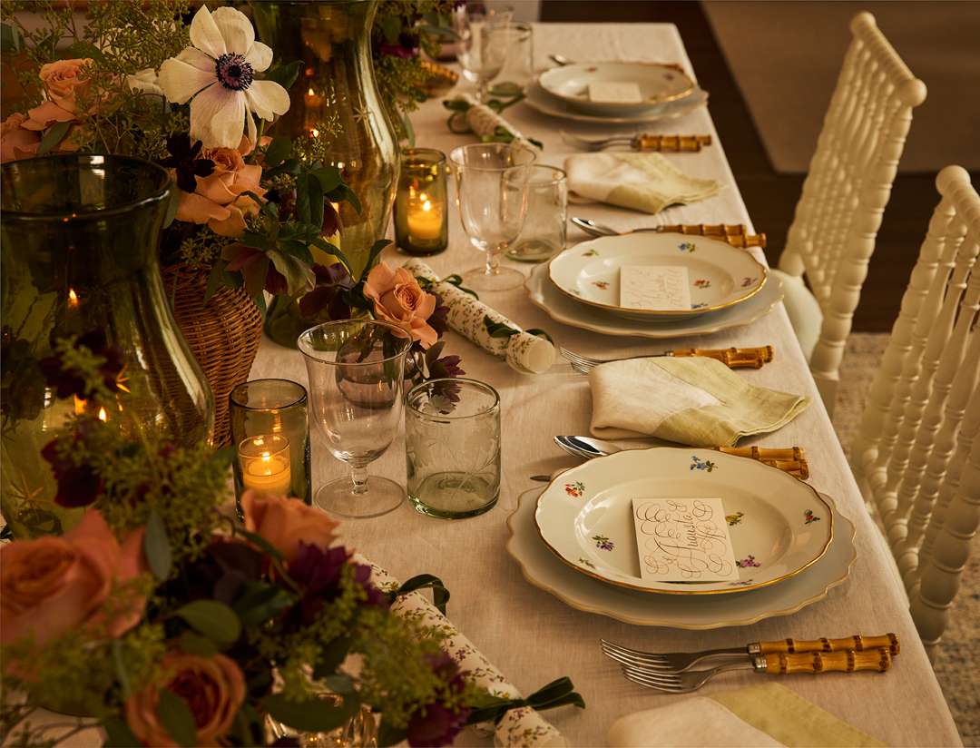 “For this holiday table, we drew inspiration from the festive fineries of Deeda Blair’s Old-World glamour, paired with the relaxed elegance of Bunny Mellon—a sensibility that feels intrinsic to Serena & Lily,” Cole says. “The design reflects a balance of collected and contemporary: my personal antiques, like 18th-century china, heirloom silver, etched hurricanes and Murano glass, layered with modern entertaining mainstays from Serena & Lily. The result is a welcoming approach to holiday entertaining at home—timeless, personal, and effortlessly elegant while mixing old and new.”