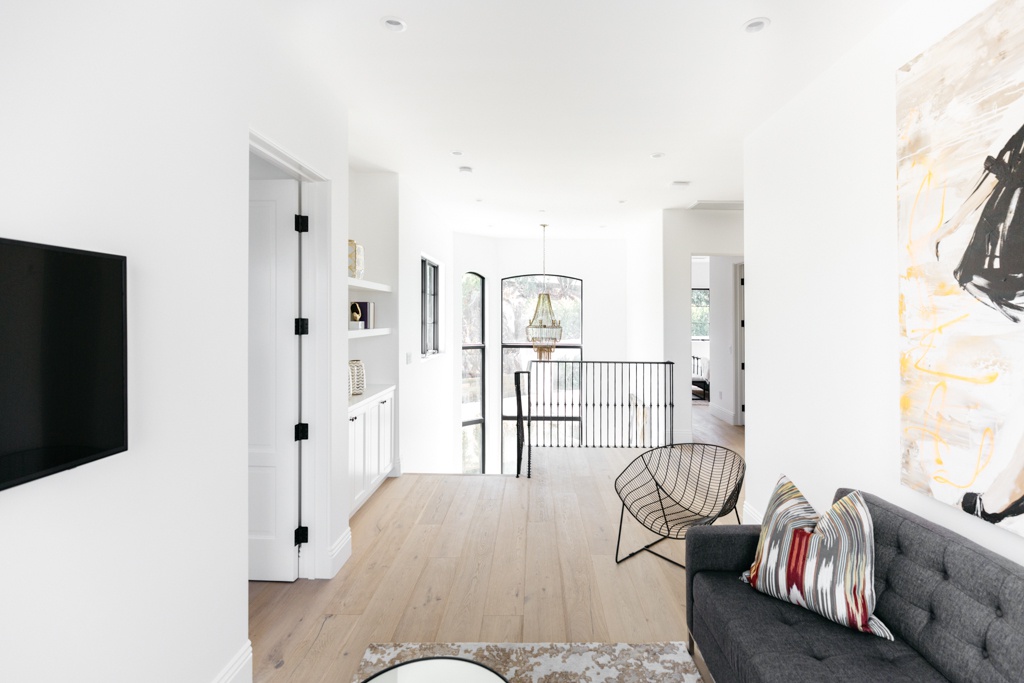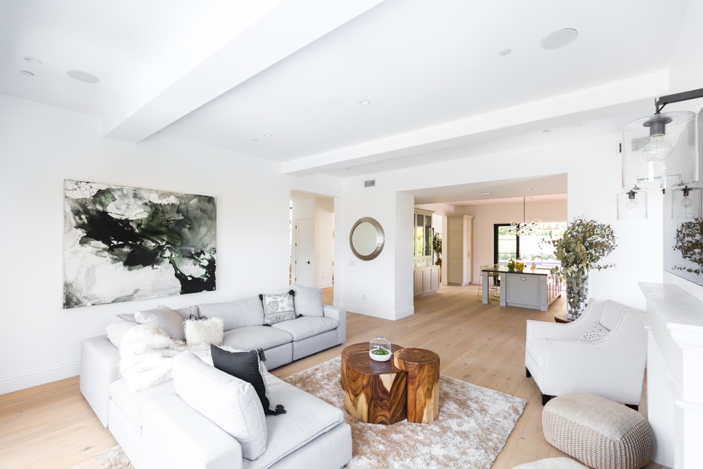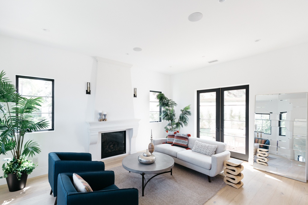 An open floor plan and crisp white walls create a bright and fresh environment throughout the home. California style shines in the kitchen with modern lighting fixtures and large Fleetwood doors that lead out to a veranda with a dining area. The spacious pad also offers luxurious finishes like Bianco Bella polished marble kitchen countertops, grass cloth wallpaper, penny round marble mosaic flooring, and custom cabinetry.