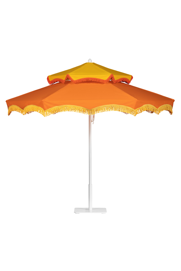 The Regency-style Double Decker umbrella—shown here in Mandarin Orange and Cornsilk—is edged with a Buttercup and Orange bullion fringe. Available through Walters.