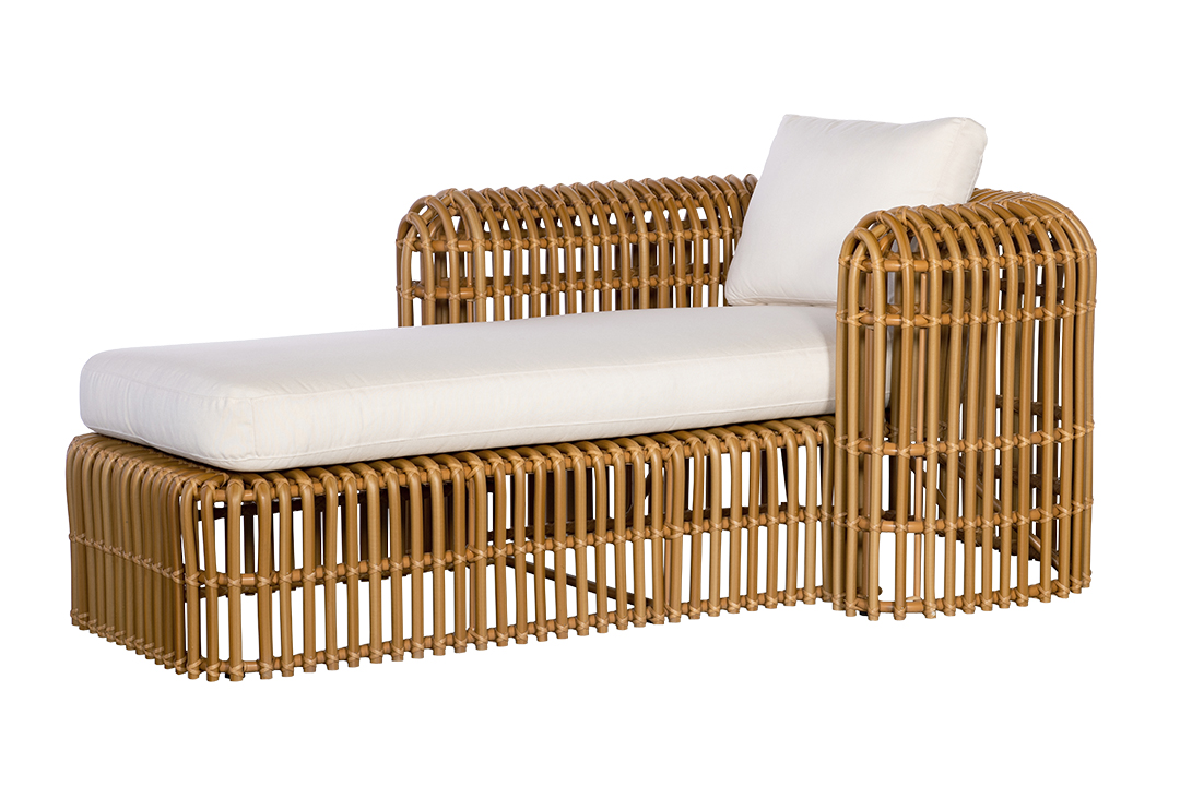 Carrier and Company’s new Gio chaise was inspired by the low-slung scale of ’70s rattan. Its arched linear form is light and airy and features an asymmetrical arm design.