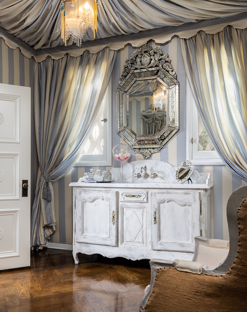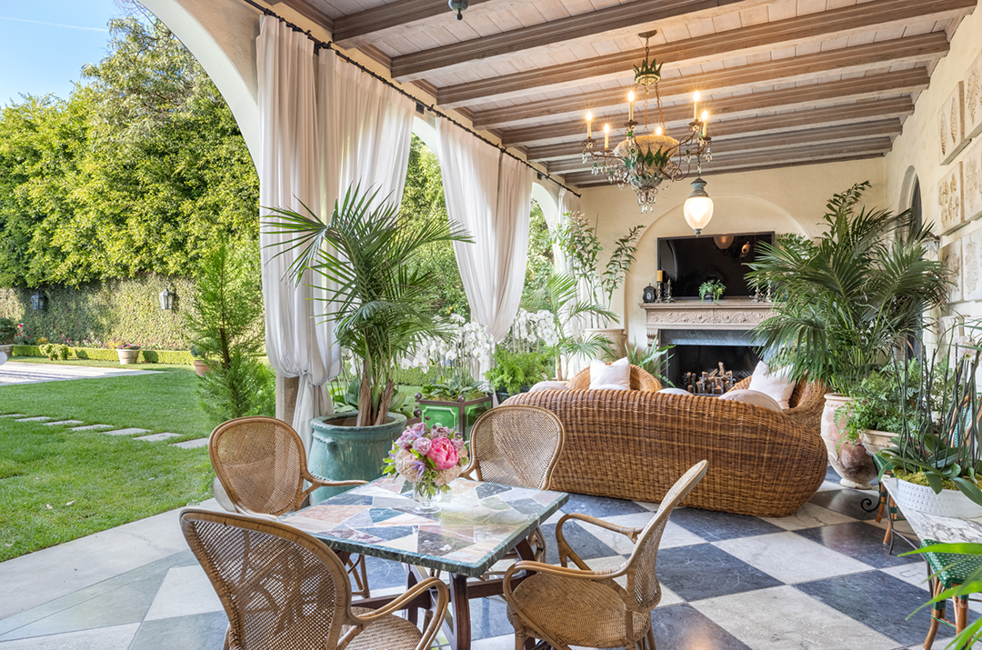 The chef’s kitchen feels far more fresh and pastoral, perhaps nodding to their English roots with its light and delicate presence. Of course, it is still very spacious and ready for high-impact hosting, as is the resort-like backyard with a covered patio, an alfresco dining area with a pizza oven and barbeque, a large pool and spa, and manicured landscaping. For overnight guests, the home has seven bedrooms. The primary suite is clearly worthy of rock n’ roll royalty, and perhaps even true royalty, with its unbelievable dressing room and opulent bathroom perfect for glamming up for major red carpet events.