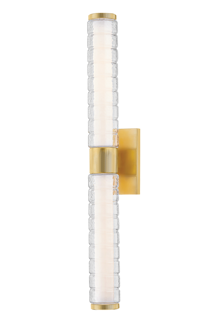 With hints of Deco, the Castor LED sconce from Hudson Valley Lighting Group lends a bit of glam with a ridged tubular design and aged brass accents.